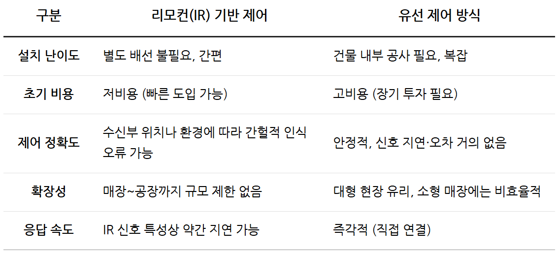 📌 기존 매장은 IR 방식으로 간편하게, 신축·대형 공장은 유선 방식으로 안정적으로— 현장 조건에 맞춰 최적의 제어를 선택할 수 있습니다.