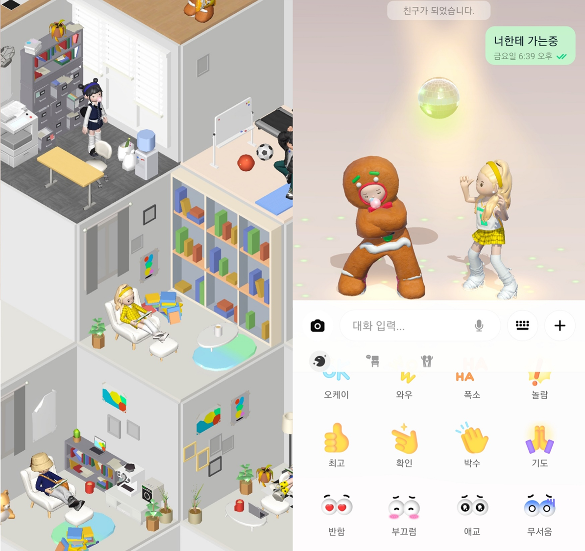 ❤️🔥트렌디한 디자인 본디는 디자인적으로도 재미있는 요소가 많아요. 이모티콘과 공감 표시만 가능한 카카오톡과 달리, 본디의 채팅창에서는 나의 캐릭터로 다양한 감정 표현을 할 수 있답니다. 친구와 대화를 나누다가 춤을 출 수도 있고 '박수'를 누르면 내 캐릭터가 역동적으로 박수를 쳐줍니다👏🏻 이외에도 방을 꾸미는 가구들이나, 캐릭터의 옷/헤어 요소도 트렌디해서 마음에 들어요.