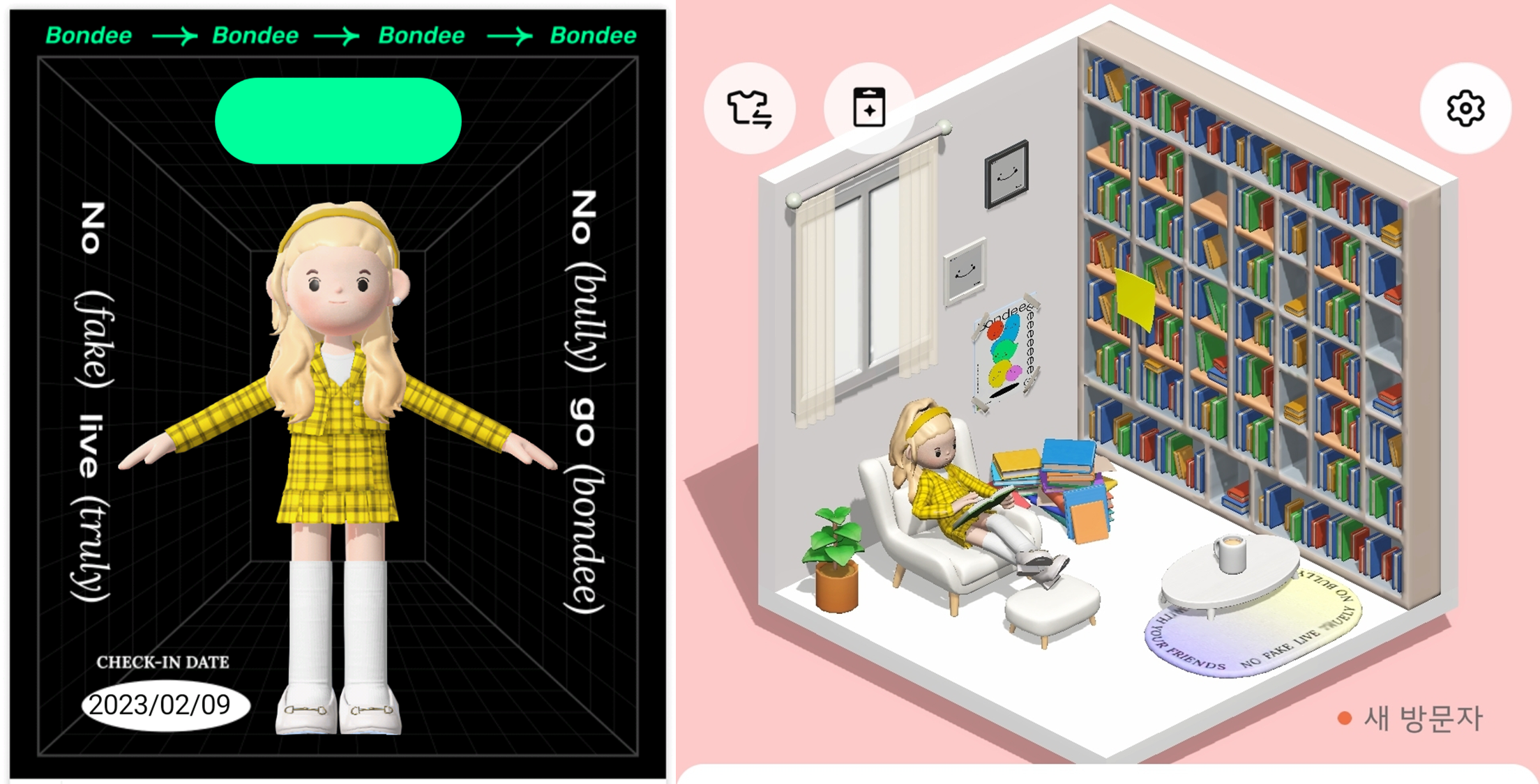 🎁메타버스표 미니홈피 본디에서는 나만의 캐릭터와 방을 만들 수 있어요. 아파트에서 친구들의 방을 구경하고 방명록도 남길 수 있습니다 (익명도 가능!) 나의 캐릭터도 내 마음대로 스타일을 바꿔가며 꾸밀 수 있고요. 저는 본디를 설치한 첫 날 2시간 동안 캐릭터와 방을 바꿔가며 시간을 보냈어요.