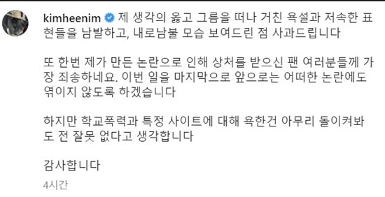 이후, 대중들의 갑론을박이 거세지자 김희철은 위와 같은 사과문을 게시했어.