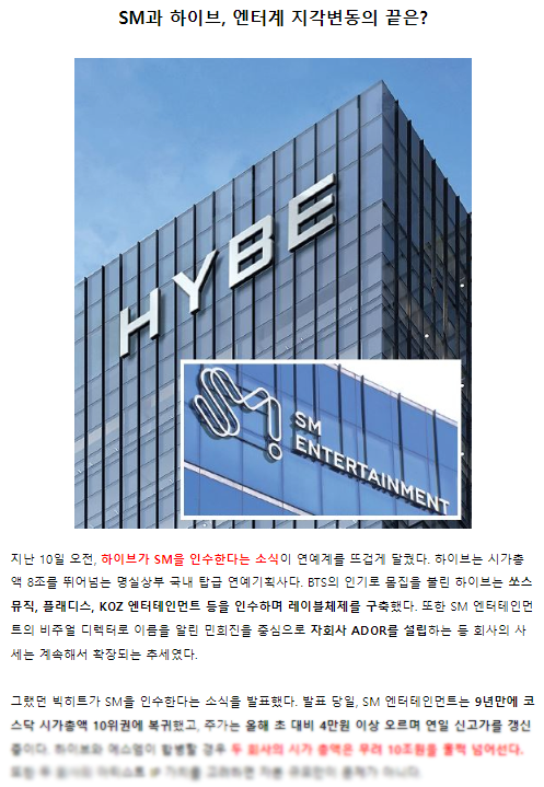 지난 10일 오전, 하이브가 SM을 인수한다는 소식이 연예계를 뜨겁게 달궜다. 하이브는 시가총액 8조를 뛰어넘는 명실상부 국내 탑급 연예기획사다. BTS의 인기로 몸집을 불린 하이브는 쏘스뮤직, 플래디스, KOZ 엔터테인먼트 등을 인수하며 레이블체제를 구축했다. 또한 SM 엔터테인먼트의 비주얼 디렉터로 이름을 알린 민희진을 중심으로 자회사 ADOR를 설립하는 등 회사의 사세는 계속해서 확장되는 추세였다.