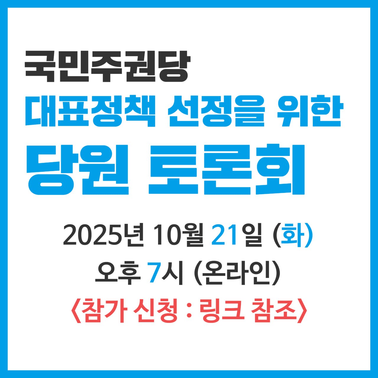 국민주권당은 우리 당의 대표 정책을 선정하는 과정에서 당원의 의견을 듣고 토론을 활성화하기 위해 10월 21일 당원 토론회를 개최합니다.