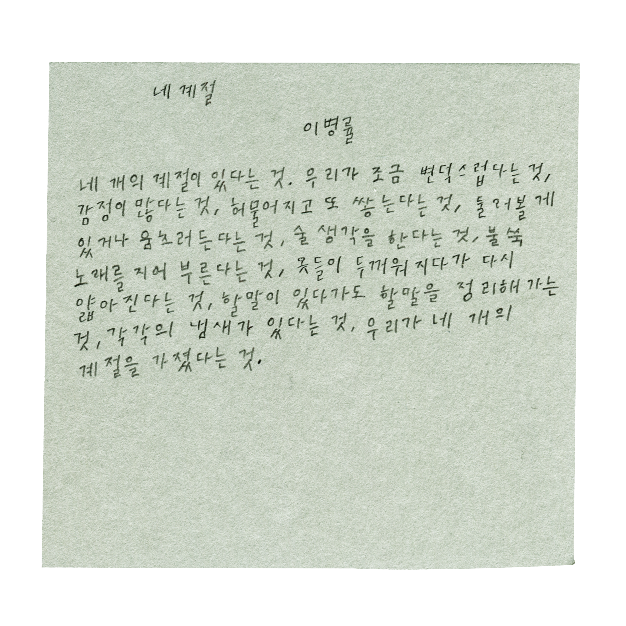 편지의 입구에서 계절에 대해 생각합니다. 우리는 어쩌다 네 개의 계절을 가지고 살아가게 된 걸까요? 이 고민을 이병률 시인은 앞서 했습니다. 그리고 이런 멋진 대답을 남겼어요. |