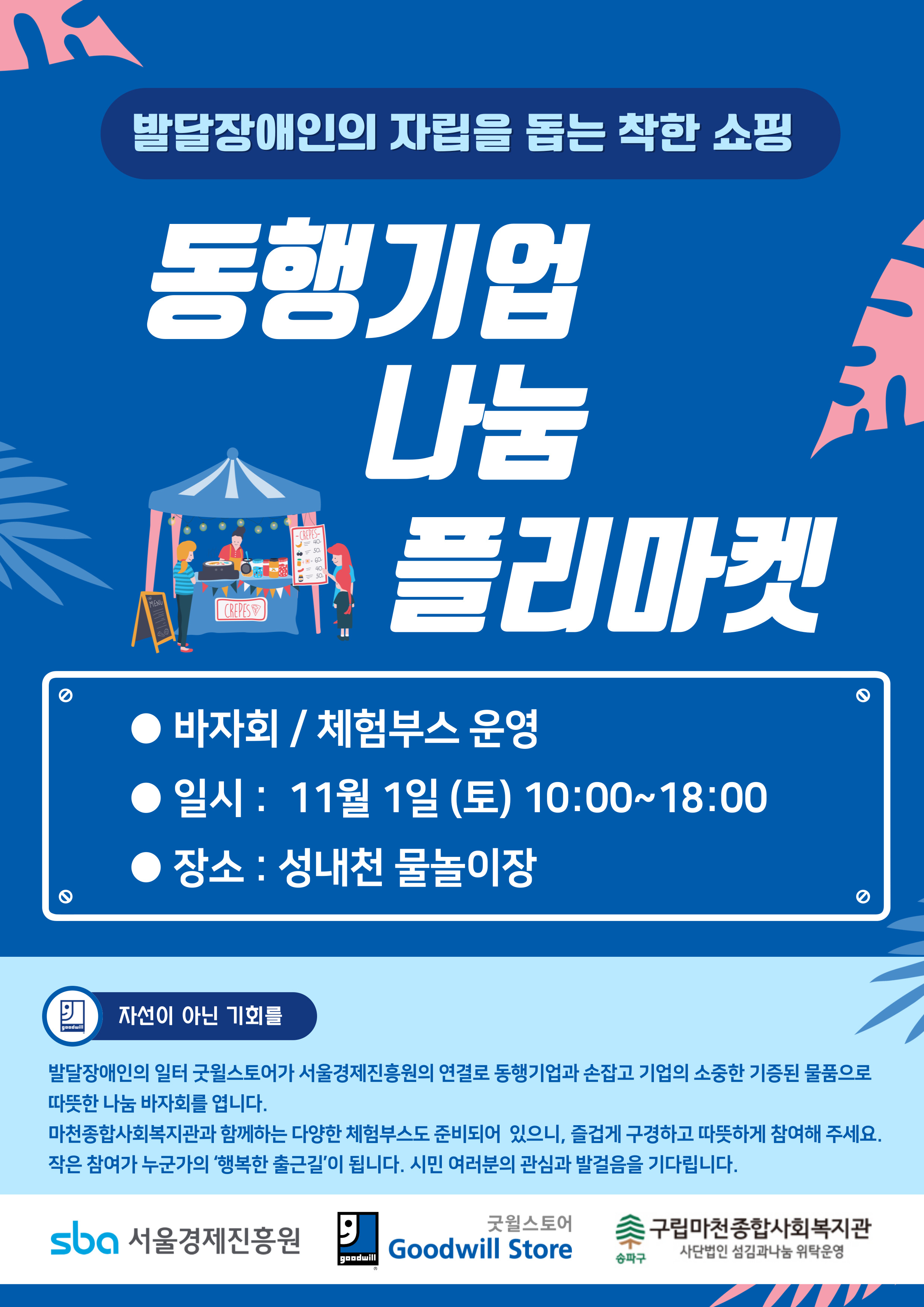 굿윌스토어가 서울경제진흥원(SBA)과 함께 ‘동행기업 나눔 플리마켓’을 진행합니다. 이번 플리마켓은 발달장애인의 자립을 응원하는 기부 바자회로, SBA가 지원하는 동행기업들이 기증한 물품을 판매할 예정입니다. 다양한 체험 부스도 준비되어 있으니, 시민 여러분의 많은 참여 부탁드립니다😊