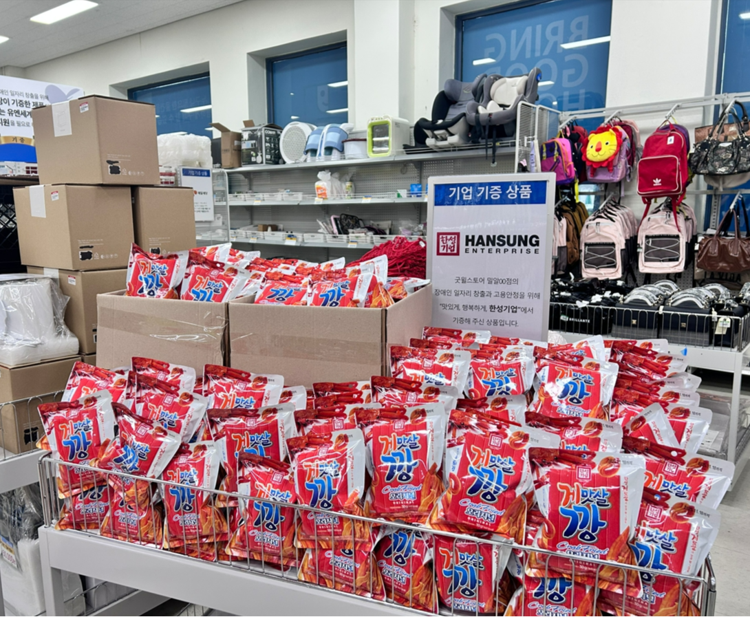 국내 대표 가공식품 제조기업, 한성기업이 발달장애인의 자립을 응원하며 하반기 새로 문을 연 굿윌스토어 매장에 맛있는 나눔을 실천했습니다. 자사 인기 제품 ‘게맛살깡’과 ‘대왕크래미’ 2만여 개를 기부하며, 새 출발을 응원하는 따뜻한 마음을 전했습니다. 한성기업의 진심 어린 후원에 감사드립니다 ✨