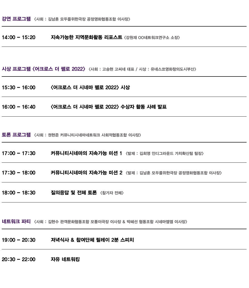 전국 각지에서 다양한 방식으로 활동하고 있는 커뮤니티시네마들의 대축전 <어크로스 더 시네마 2022>에 여러분을 초청합니다. 함께 자리하시어 행사를 빛내주시기 바랍니다. |