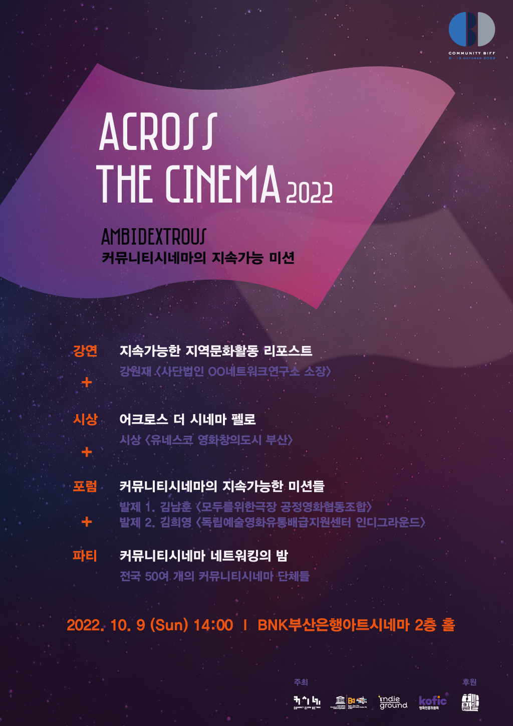 코로나 팬데믹으로 인해 2018년과 2019년 2년간 개최되고 열리지 못했던 부산국제영화제 커뮤니티비프의 공식 프로그램인 <어크로스 더 시네마>가 3년 만에 다시 돌아왔습니다.