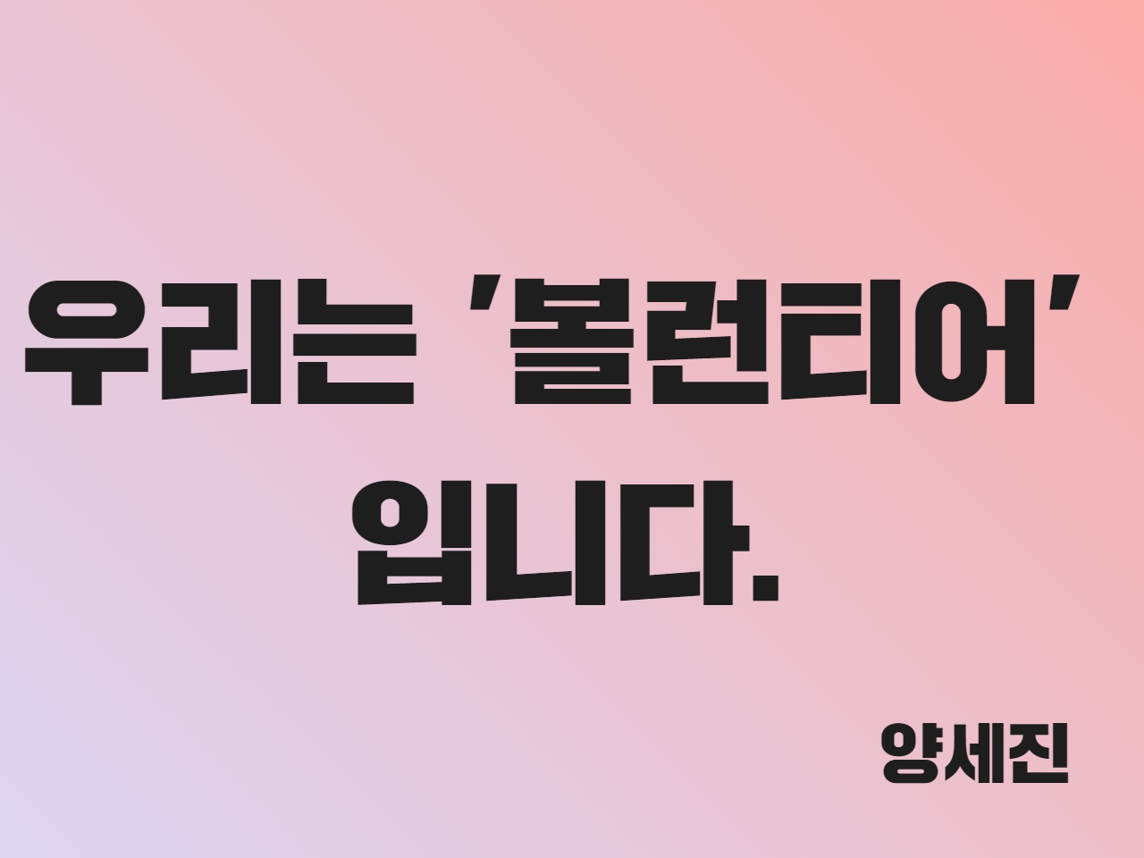 우리는 자원봉사자입니까? ‘볼런티어’입니까? 같은 말이 아니냐구요? 우리가 자랑스럽게 생각하는 우리 자신의 정체성이자 우리의 본래적인 존재방식에 대해 캐물어보고자 합니다.