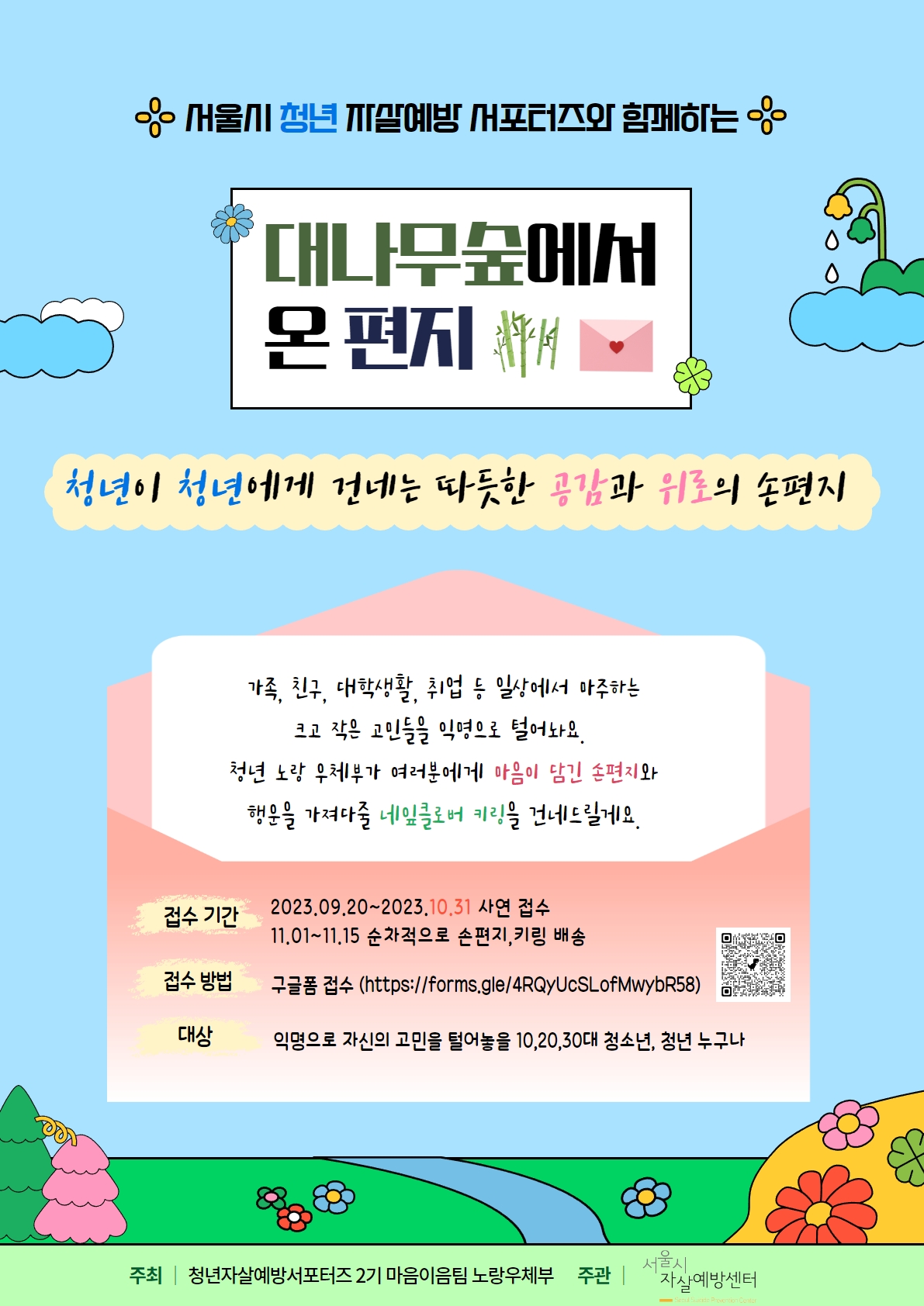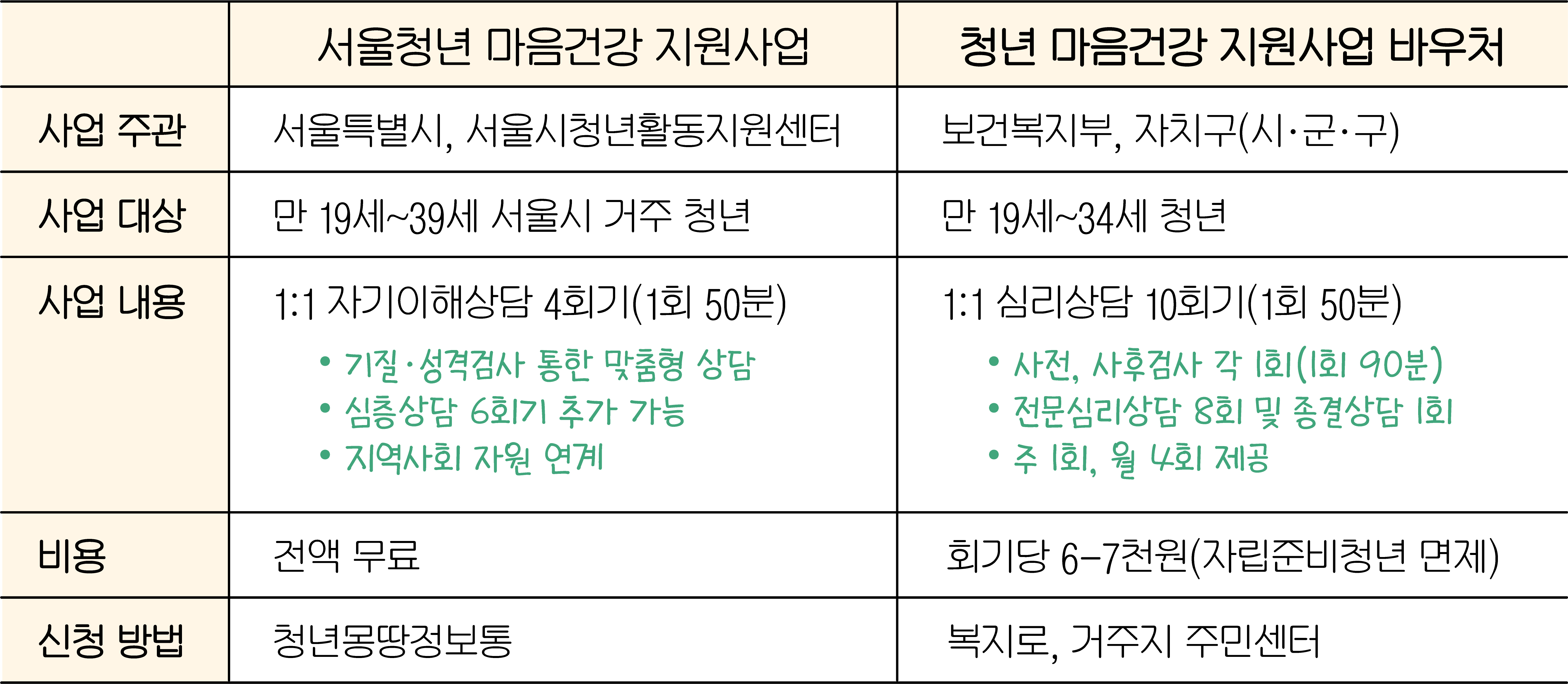 ์ด๋ผ๋ฉด ๋๊ตฌ๋ ๋ฌด๋ฃ๋ก ์ด์ฉํ ์ ์์ด์. ์์ธ์ ๋ด ์ด 4๊ฐ(์กํ๊ตฌ, ๋๋ด๊ตฌ, ์์ฒ๊ตฌ, ๋๋๋ฌธ๊ตฌ)์ ์ผํฐ ์ค ๊ฐ๊น์ด ๊ณณ์ ์์ฝ ํ ๋ฐฉ๋ฌธํ๋ฉด ์ฌ๋ฆฌํ๊ฐ ๋ฐ ์ต๋ 8ํ๊ธฐ์ ์ ๋ฌธ ์ฌ๋ฆฌ์๋ด์ ๋ฌด๋ฃ๋ก ๋ฐ์ ์ ์์ด์. ๋ง์์ฑ๊น๊ณผ ๋์ธ๊ด๊ณ์ ๋์์ด ๋๋ ๊ต์ก ํ๋ก๊ทธ๋จ๋ค๋ ๋ณด์ด๋ค์.