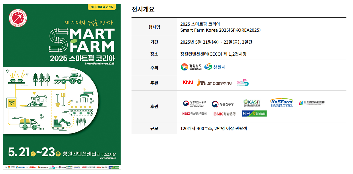 AI와 로봇기술이 결합한 디지털 농업의 활성화를 모색하는 '2025 스마트팜 코리아'가 경남 창원컨벤션 센터(CECO)에서 개최됩니다. 2025년 5월 21일부터 23일까지 3일간 열리는 이번 행사에 윌로펌프는 농업용 제품을 중심으로 혁신적인 솔루션을 선보일 계획입니다. |