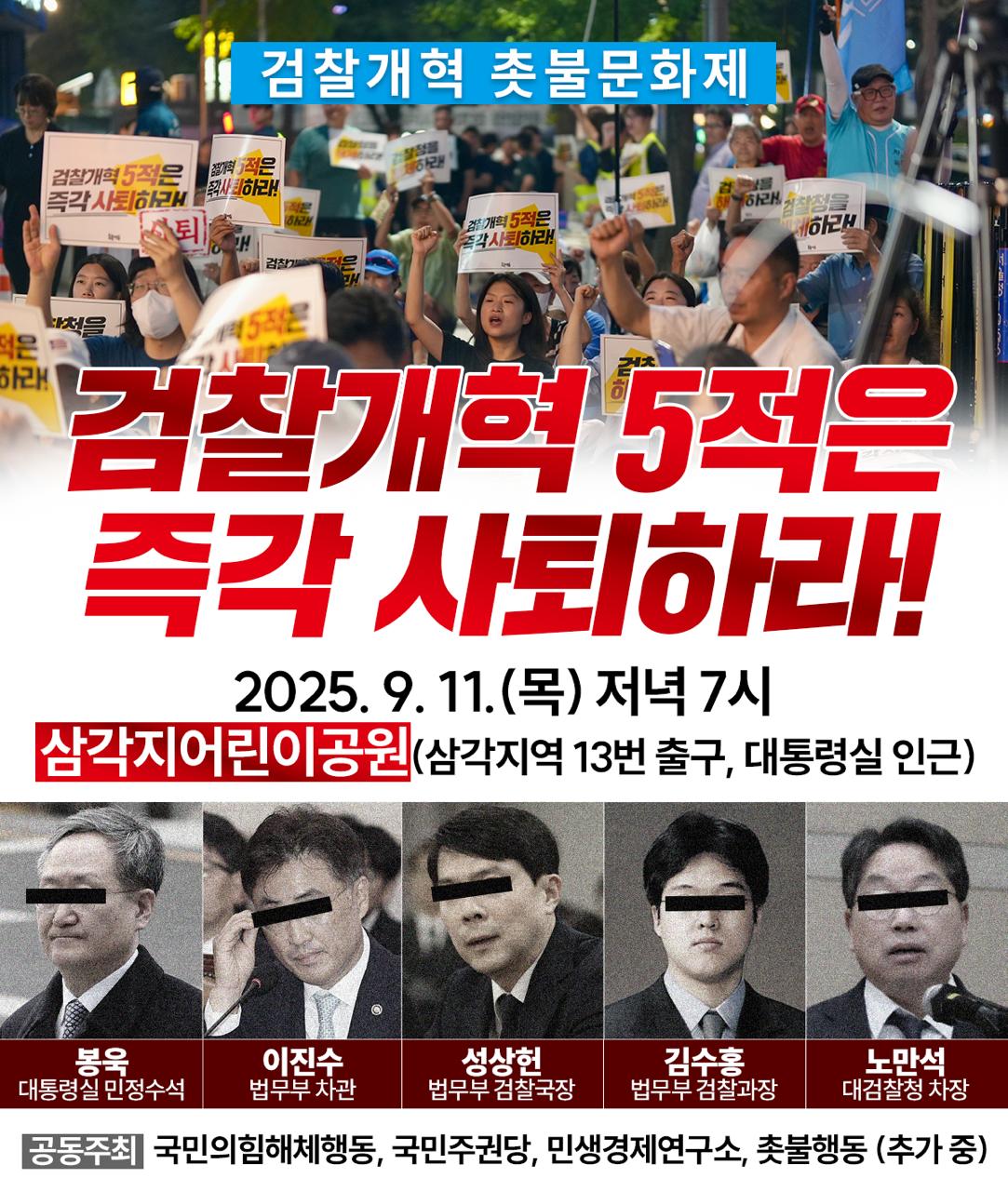 - 이에 대통령실 앞에서 검찰개혁 5적 사퇴를 촉구하는 검찰개혁 촛불문화제를 진행합니다.