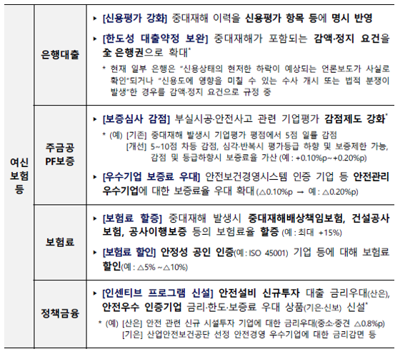 정부가 중대재해 발생 기업에 대한 금융·투자 제재를 강화한다. 금융위원회는 ‘노동안전 종합대책’의 금융부문 세부안을 발표하며, 중대재해 이력이 신용평가, 대출 심사, 보험료, ESG 평가 등에 직접 반영된다고 밝혔다. 은행은 사망사고 등 중대재해를 여신심사에 반영하고, 대출 약정에 한도 감액·정지 조항을 포함한다. PF 보증 심사에서도 위법 수준에 따라 보증 제한이 확대되며, 기업평가 점수는 최대 10점까지 감점된다. 보험료는 중대재해 반복 여부에 따라 최대 15%까지 할증되며, 안전 인증 기업은 5~10% 할인 혜택을 받는다. 정책금융기관은 안전관리 우수기업에 금리·한도 우대 상품을 제공한다. 상장사는 중대재해 발생 및 형사판결 사실을 당일 수시 공시해야 하며, ESG 평가기관과 기관투자자는 이를 투자 판단 요소로 활용하도록 관련 지침이 개정된다. 이번 조치는 기업의 안전관리 책임을 강화하고 투자자 보호를 위한 금융권의 선제적 대응으로 풀이된다.