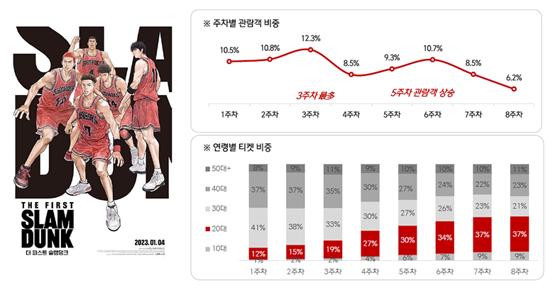 실제로 극장 애니메이션 TOP3인 <엘리멘탈><스즈메의 문단속><더 퍼스트 슬램덩크>는 여성 관객의 비중이 높습니다. 기존 극장용 일본 애니메이션은 1020 남성 위주의 시장이었다고 해요. 연령대에서도 20~30대 관람 비중이 높습니다. 보통 흥행영화들의 관객 분포는 2030 여성이라는 점에서 어찌 보면 당연한 결과일 수도 있지만, 그만큼 ‘대중적’인 작품이었다는 뜻도 됩니다.