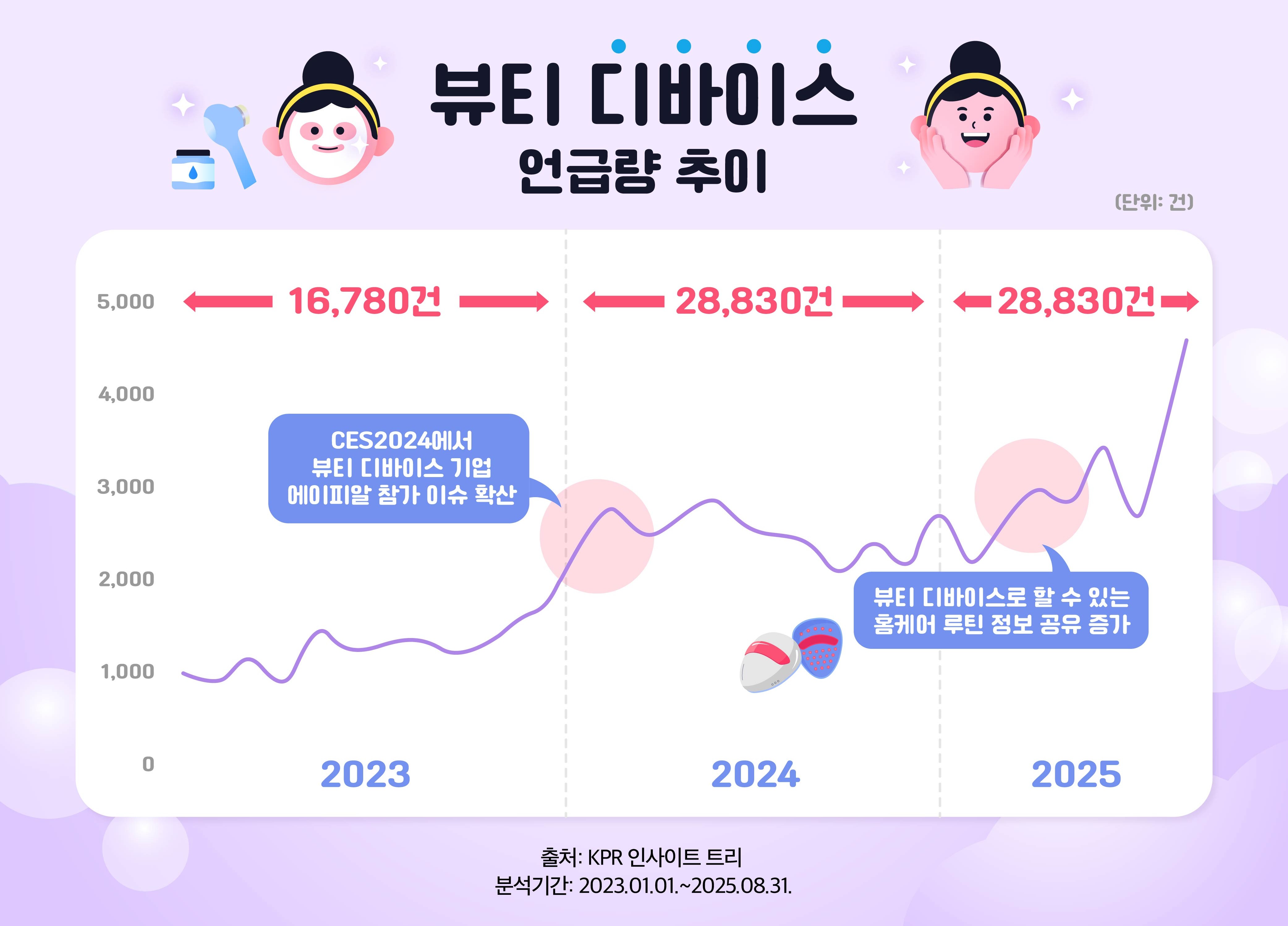 빅데이터 분석에 따르면 뷰티 디바이스 관련 언급량은2023년 16,780건에서 2024년 28,830건을 기록했으며, 2025년 8월에는 23,806건으로 크게 증가하며 상승세를 보였습니다. 특히, 2025년 1월 라스베이거스에서 개최된 세계 최대 규모의 전자기기 박람회 CES2025에 국내 뷰티 디바이스 대표 브랜드 에이피알이 참석하면서 전통적인 뷰티 산업에서 기술, 테크 분야까지 확장되고 있음을 확인했습니다.