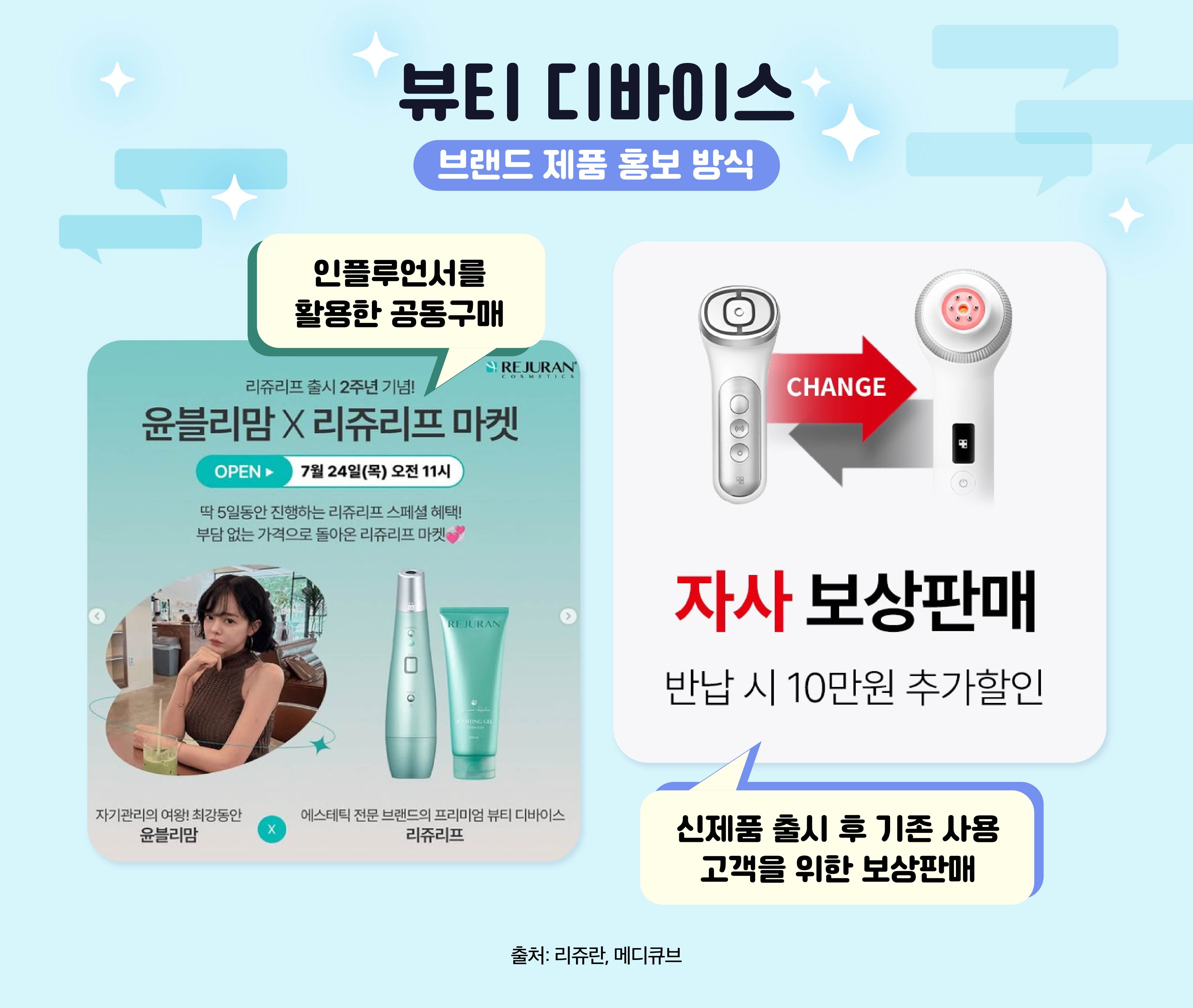 디바이스 시장에서 경쟁이 심화됨에 따라 뷰티 디바이스 브랜드들은 마케팅 및 홍보 전략에서도 차별화를 시도하고 있습니다. 특히, 뷰티 디바이스 브랜드는 일회성으로 제품 홍보 보다 구매 가능성이 높은 소비자를 겨냥해, 가격 혜택이나 체험 기회를 제공하는 전략을 활용하고 있습니다. . 리쥬란은 뷰티 인플루언서와 협업해 공동구매를 열고, 정가보다 저렴한 가격으로 한정된 기간동안 판매량을 확보했습니다다. 메디큐브는 신제품을 출시하면서 기존 고객을 대상으로 추가 할인을 제공하는 보상 판매를 진행했습니다.