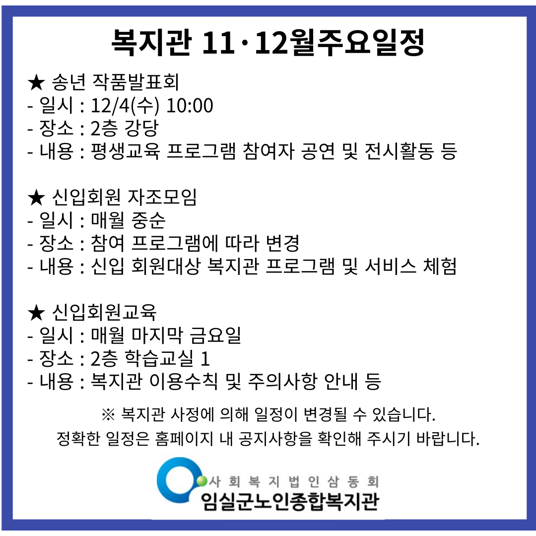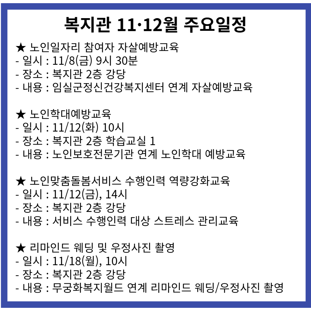 (55927) 전북특별자치도 임실군 임실읍 운수로 33-46(이도리), 임실군노인종합복지관Tel : 063-644-4438 / Fax : 063-644-4436 / E-mail : issenior@naver.com
