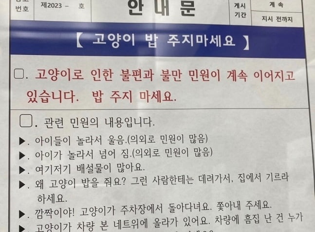 주민들의 피해가 가중되며 갈등이 깊어지고 있지만, 캣맘·캣대디는 '인간이 감수해야 할 일'이라는 입장을 숙이지 않습니다. 지난해 말, 길고양이에게 먹이를 주지 말라는 한 아파트 공고문을 두고 캣맘들은 "동물권을 보호해야 한다"고 반발했습니다.
