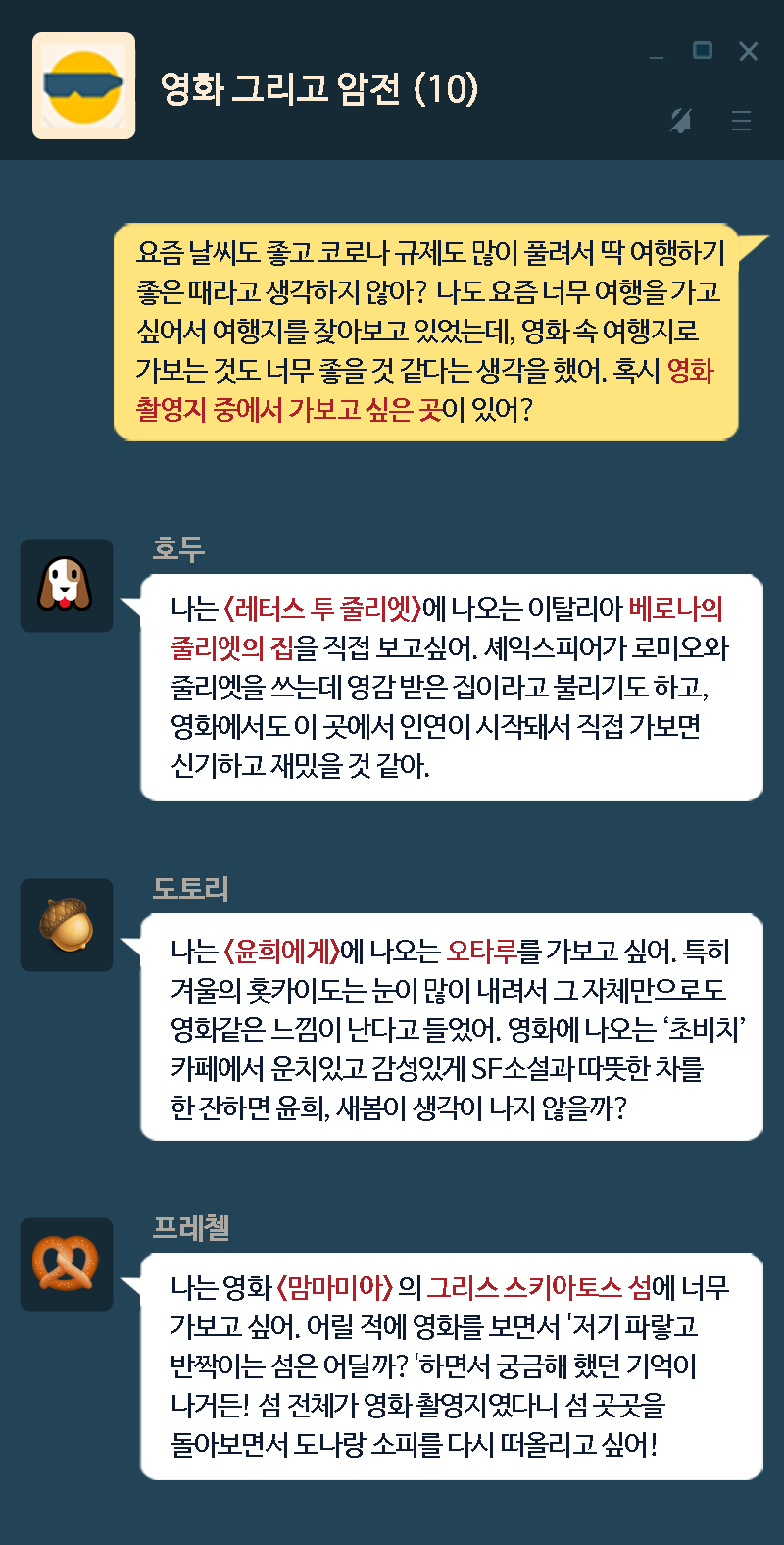 μ¬ λ±μ μ°Ύμλ³Ό μ μμ§λ§, μμμ ν¨κ» λ¨ΉμΌλ©° μν μ λ±μ₯μΈλ¬Όλ€μ΄ νμ΄λ΄λ μ΄μΌκΈ°λ₯Ό λ€μΌλ©° κ΄κ°λ€μ΄ 곡κ°νκ³ μλ‘λ°λ κ² μλκΉ μΆμ΄μ.
