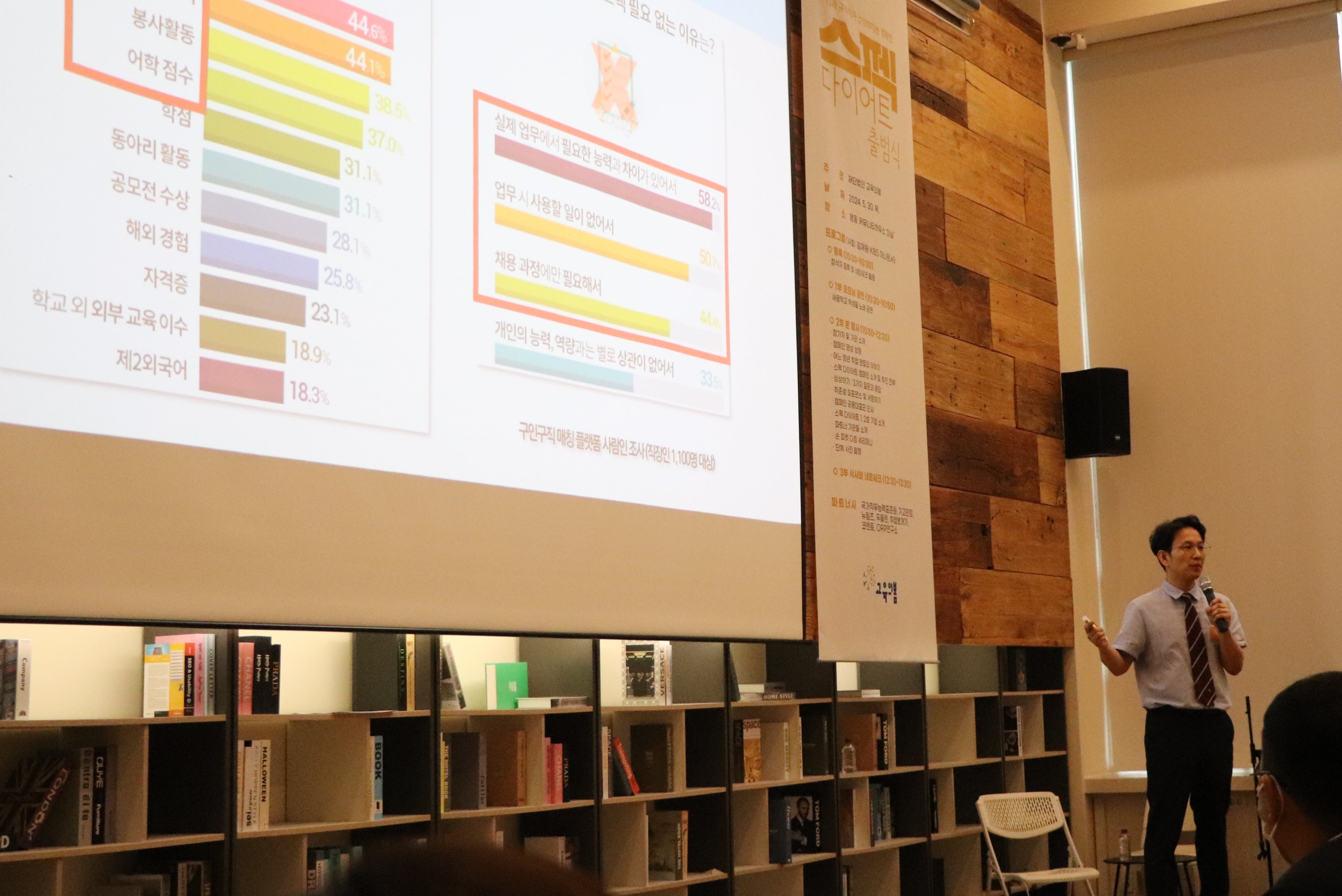 이날 출범식에서 전선희 교육의봄 연구팀장은 스펙 다이어트 캠페인의 필요성에 대해 상세히 설명했습니다. 전 팀장은 불필요한 스펙 경쟁은 단순히 취준생 개인의 손해가 아니며, 기업 그리고 더 나아가 국가 전체에 매우 큰 손해가 되고 있다고 강조했습니다. 그는 최근 80%가 넘는 기업이 적합한 인재가 부족하여 채용 인원을 채우지 못하고 있다는 설문조사를 인용하며(링크), 기업은 취준생들이 충분한 역량을 갖추지 못한 것으로 판단하고 있다고 설명했습니다. 하지만, 그 이유는 취준생들이 불필요한 스펙을 쌓기 위해 많은 시간과 비용을 들이고 있기 때문이라는 것입니다. 이러한 취준생과 기업의 채용에서의 미스매치는 일부 예외적 현상이 아니라 국내에 만연한 것으로 이는 국가적으로도 큰 손해가 되고 있다고 언급했습니다.