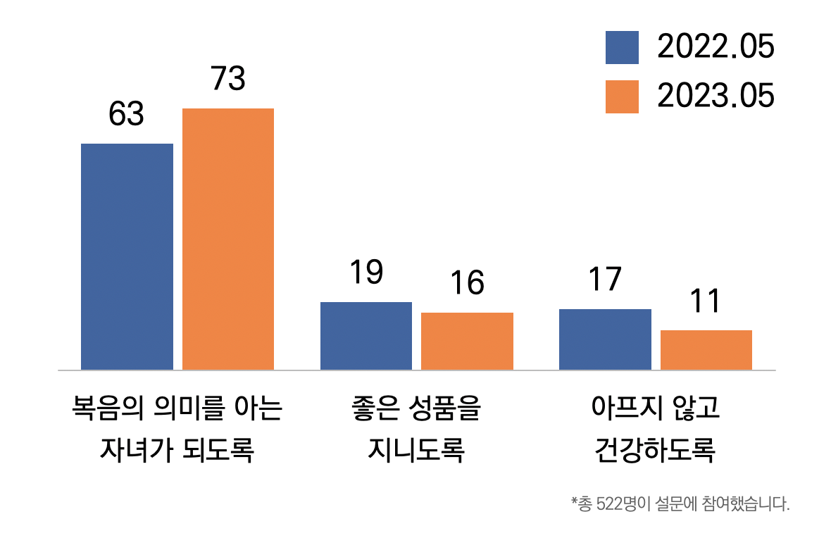 : 목회데이터연구소 구독자에게 5월 가정의 달을 맞아 자녀를 위한 기도 제목에 대해 물은 결과, ‘복음의 의미를 아는 자녀가 되도록’이 73%로 압도적으로 높았고, 다음으로 ‘좋은 성품을 지니도록’ 16%, ‘아프지 않고 건강하도록’ 11% 순으로 응답됐습니다. 2022년 5월 넘버즈폴 동일 문항 조사 대비 ‘복음의 의미를 아는 자녀가 되도록’을 꼽은 비율이 10%p 더 높았습니다. 넘버즈[180호]를 보면 한국 대학생 중 무종교인 비율이 10명 중 7명에 달하고, 개신교 대학생 중 예수 그리스도를 주로 영접한 비율은 33%에 불과했습니다. 자녀를 위한 기도제목으로 ‘복음을 아는 것’이 가장 많이 응답된 점은 점점 다음세대 사역이 힘들어지고, 기독교가 퇴색되고 있는 현 시대의 어려움을 반영한 결과로도 해석될 수 있을 것입니다.