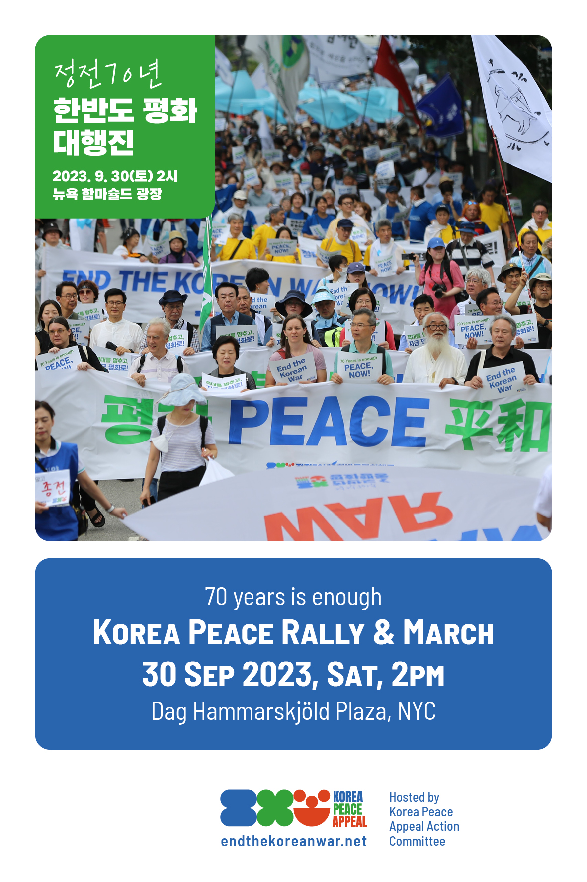 Saturday, September 30, 2023, 2 ~ 4 pmDag Hammarskjรถld Plaza -> Ralph Bunche Park, NYC๐ฃ End the Korean War!๐ Armistice to Peace!This year marks the 70th year of the Korean War Armistice Agreement. 70 years have passed with no sign of the end of war.With an uneasy ceasefire far from over, an unprecedented threat of war is brewing again. In a vicious cycle of head-to-head confrontation, including large-scale ROK-US and ROK-US-Japan Combined Military Exercises and DPRK missile tests, armed conflict is on the horizon. The military confrontation in Northeast Asia is also becoming more and more intense.Efforts should focus on โpreventingโ armed conflict, not practicing war. We must take urgent steps to reduce military tensions and create an environment for dialogue again. Now is the time to stop hostility and walk towards peace.The <Korea Peace Appeal Campaign> plans to deliver the signatures collected from all around the world over three years and the results of the Campaign to the United Nations Secretary-General and the UN Missions of the two Koreas, the US, and China on the occasion of the 70th anniversary of the Korean Armistice. Thus we will urge everyone to raise an awareness of the gravity of the growing threat of war on the Korean Peninsula under the recent political situation. And we will call for proactive efforts to create an environment for dialogue and prevent armed conflict.Ahead of the delivery of our collection of signatures, we're once again raising our voices for "peace over war" in New York City. There will be speeches, performances, a Korean traditional folk music experience called โPungmulโ, and marches. Please join us if you want peace! ๐Host : Korea Peace Appeal Action CommitteeContact : Korea Peace Appeal Campaign Secretariat +82-2-723-4250 endthekoreanwarnow@gmail.com |