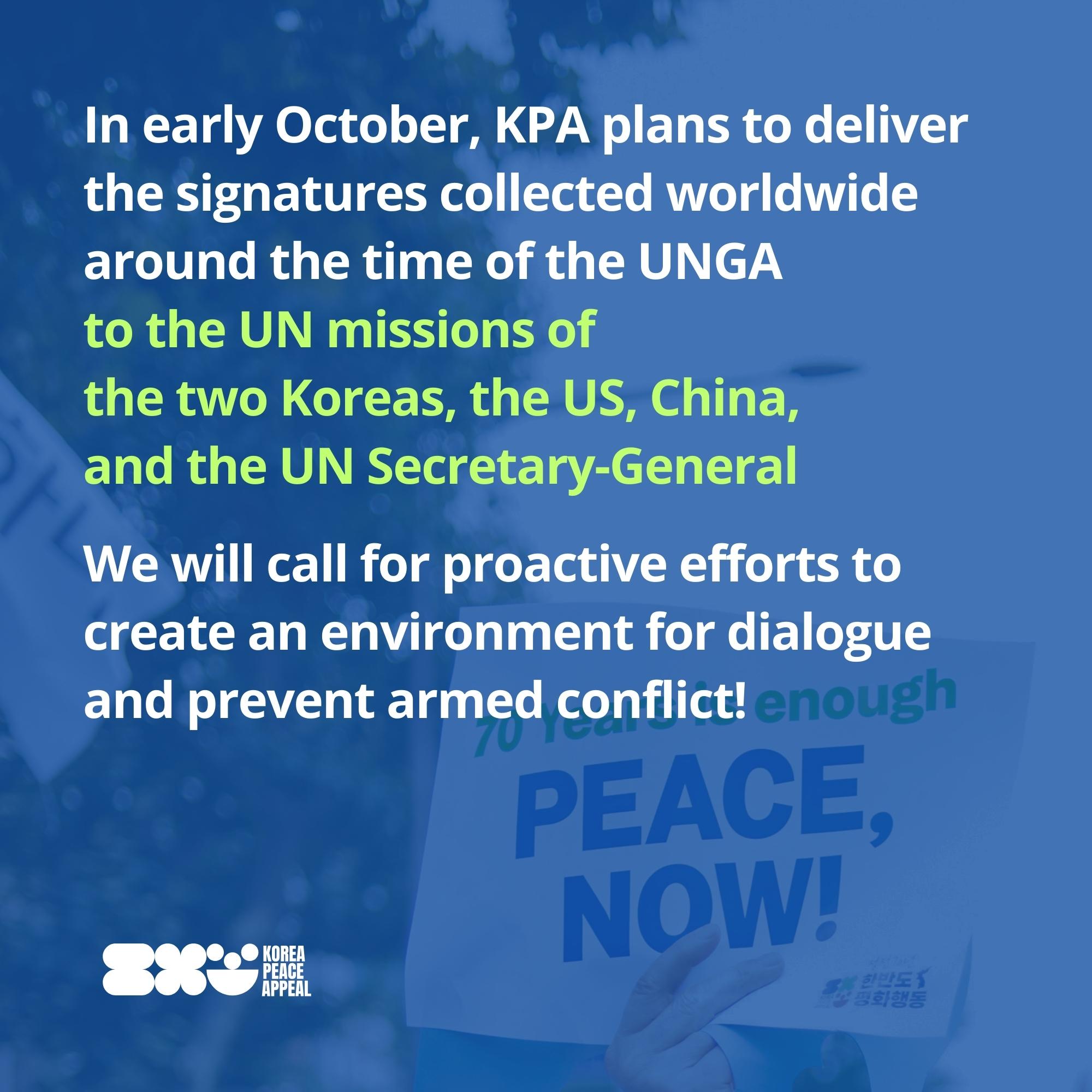 The <Korea Peace Appeal Campaign> plans to deliver the signatures collected from all around the world over three years and the results of the Korea Peace Appeal(KPA) Campaign to the United Nations Secretary-General and the UN Missions of the two Koreas, the US, and China on the occasion of the 70th anniversary of the Korean Armistice.