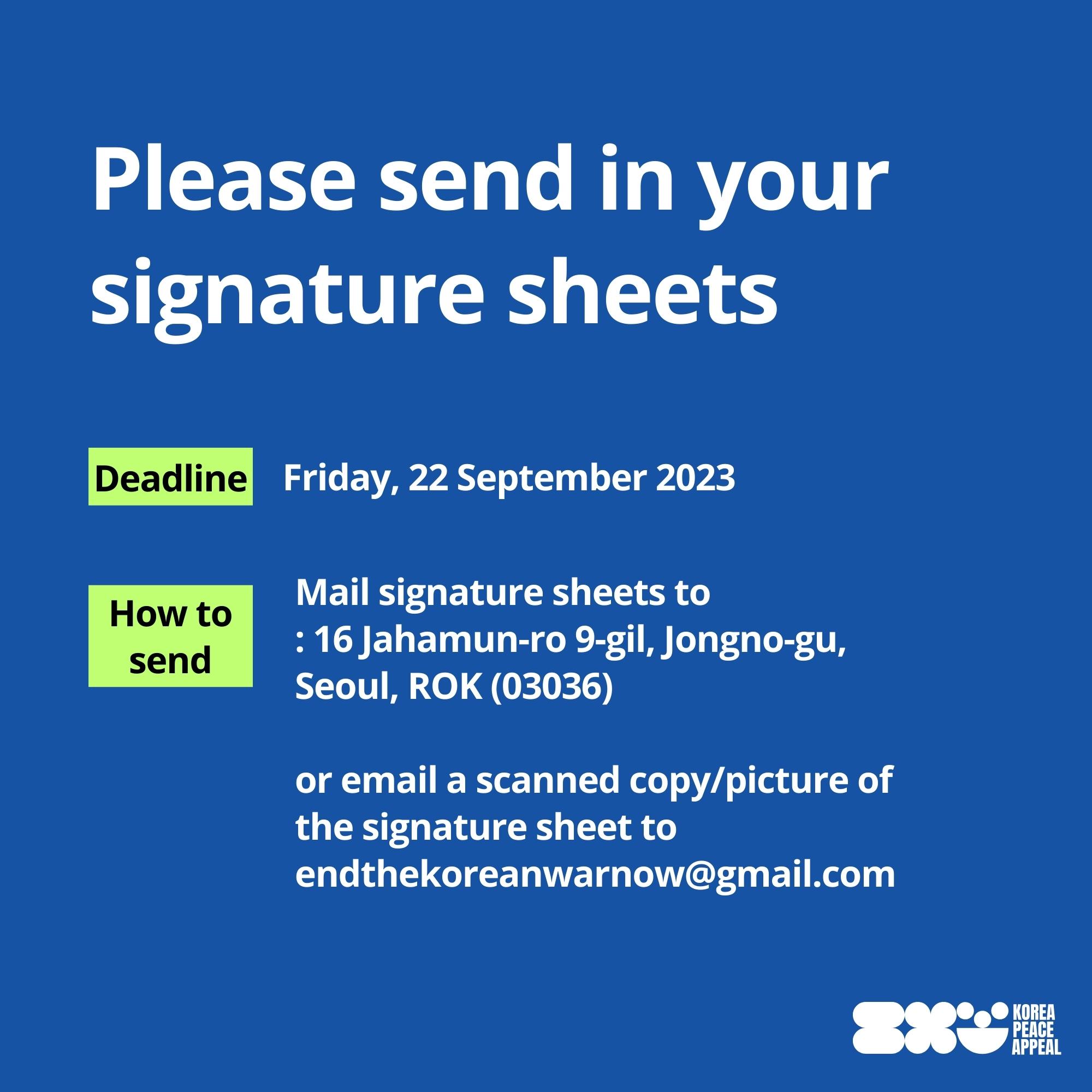 - How to send : Mail signature sheets to : 16 Jahamun-ro 9-gil, Jongno-gu, Seoul, ROK (03036) or email a scanned copy/picture of the signature sheet to endthekoreanwarnow@gmail.com
