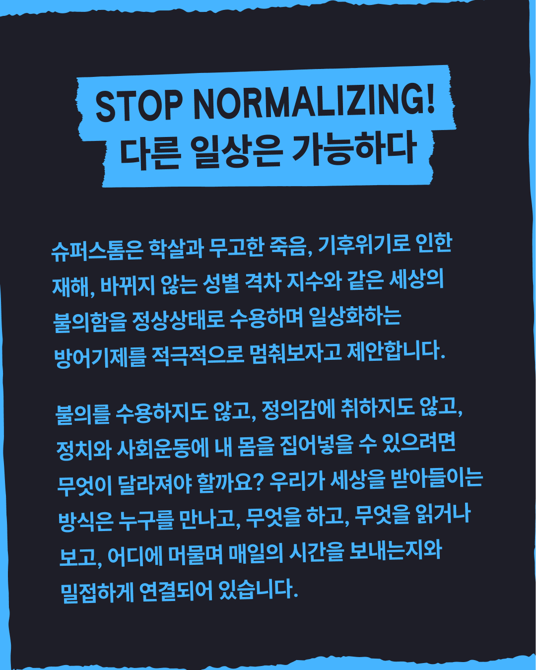 내 몸과 마음이 편안한 삶의 방식에 익숙해지기란 너무나 쉽다고 생각합니다. 저는 전 대통령이 탄핵되자마자 정치 상황이나 사회운동에 신경을 덜 쓰게 되었고, 뉴스를 잘 보지 않게 되었습니다. SNS에서 이스라엘의 팔레스타인 가자 공습 소식을 접하면 끔찍한 장면을 보고 싶지 않아서, 더 솔직히는 죄책감을 느끼고 싶지 않아서 스크롤을 빠르게 올려버릴 때가 가끔 있습니다. 이런 경험을 떠올리면서, 사회운동에 몸과 마음을 집어넣기 위해서는 결국 우리 각자의 일상을 바꿔야 한다는 결론을 내리게 되었어요. 우리는 어떤 일상을 구성해야 할까요? 무엇에 익숙해져야 하고, 무엇에 익숙해지지 말아야 할까요? 익숙해질 것을 우리 스스로 선택할 수 있다고 생각하지 못했다면, 달라지고 싶은데 어떻게 달라져야 할지 혼란스럽다면, 슈퍼스톰의 첫 캠페인에 함께해 주세요.