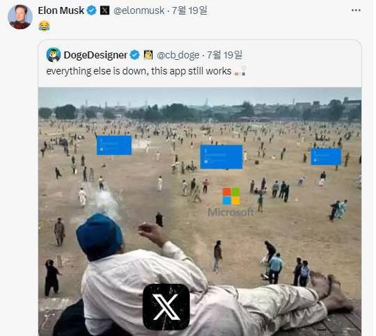 머스크 "웃프다": "다른 모든 것이 다운 됐는데, 이 앱 (MS 윈도)는 여전히 잘 돌아가네요."라는 트윗에, '웃픈' 이모티콘을 남긴 머스크