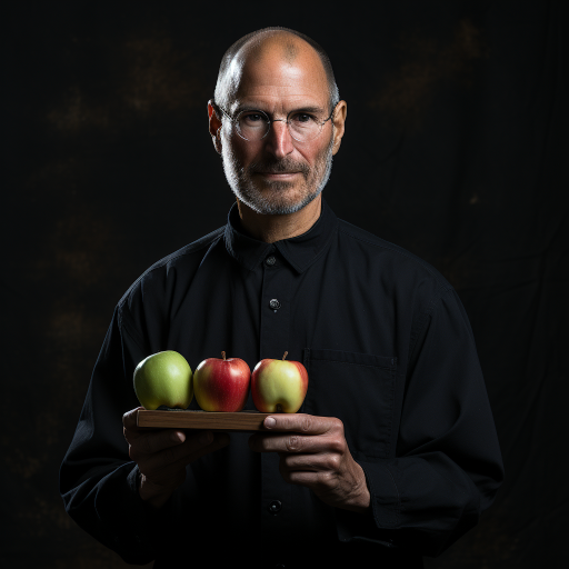 스티브 잡스: 사과 3개를 들고 있는 상상도 (Created with Midjourney)