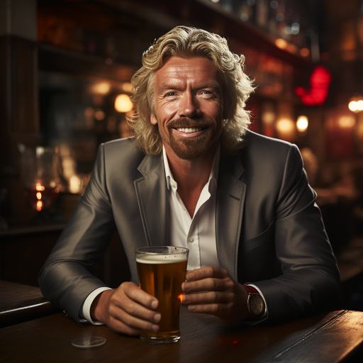 리처드 브랜슨: 맥주와 비어매트 앞에 앉은 상상도 (created with midjourney)