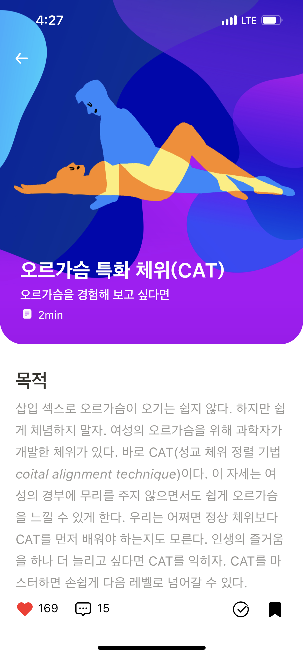 명진 저는 CAT 콘텐츠요. 여성과 남성이 삽입 섹스를 하면서 동시에 오르가슴을 느낄 수 있는 과학적인 체위를 알려주는 콘텐츠예요. 파트너랑 같이 느낄 수 있는 방법을 찾아가는 것도 재밌는 성 경험이 될 거라 생각해요. |