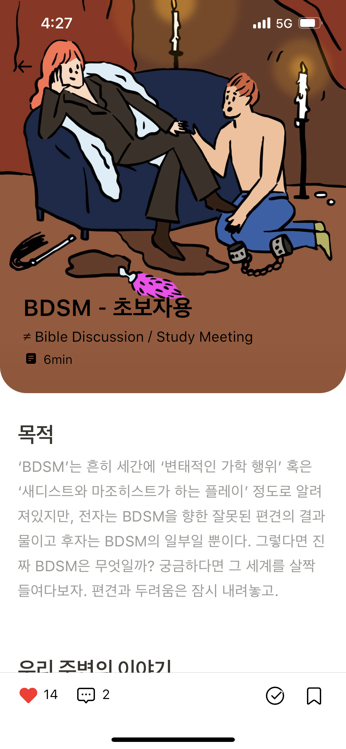 아란 BDSM의 세계에도 룰이 있는데, 잘못된 정보 때문에 피해를 볼 수 있잖아요. BDSM을 궁금해하는 여성이 있다면 정제된 정보를 접할 수 있게 해주자고 생각했어요.