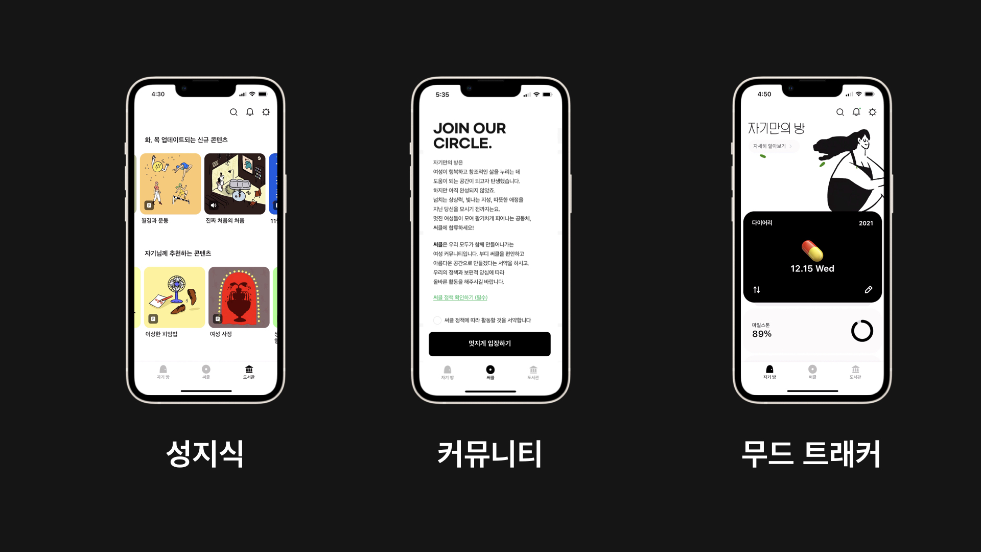 명진 ‘자기만의 방’은 여성에게 필요한 성 지식을 제공하는 앱이에요. 앱 내에서 월경 주기를 기록하고, 무드 트래킹을 할 수도 있어요. 여성끼리 고민을 나누는 커뮤니티 ‘써클’에서 활동할 수도 있고요. 여성 웰니스에 관한 것이라면 무엇이든 하고 싶어요. 사람들에게 편안함을 주는 플랫폼이 되고 싶거든요.