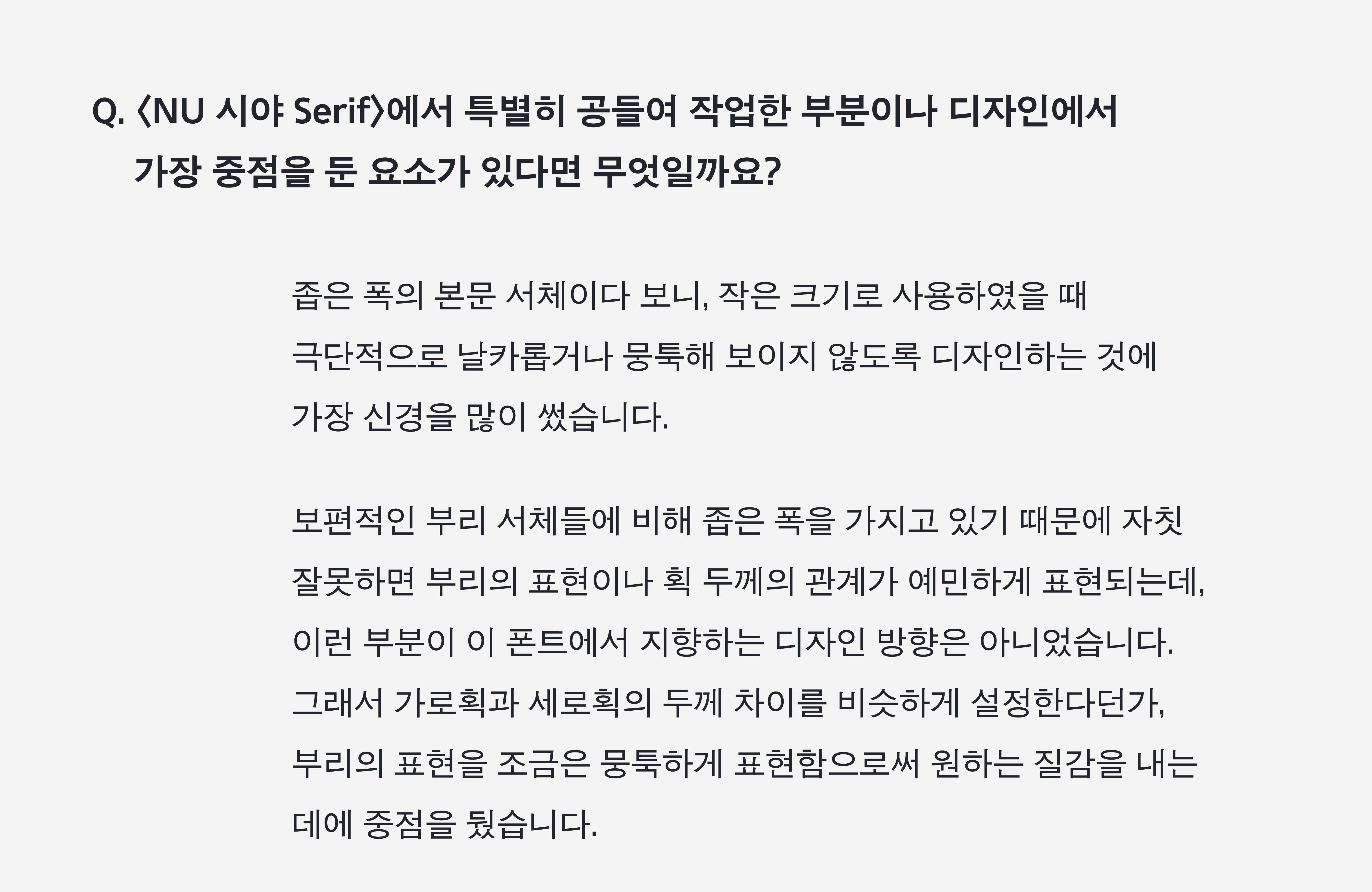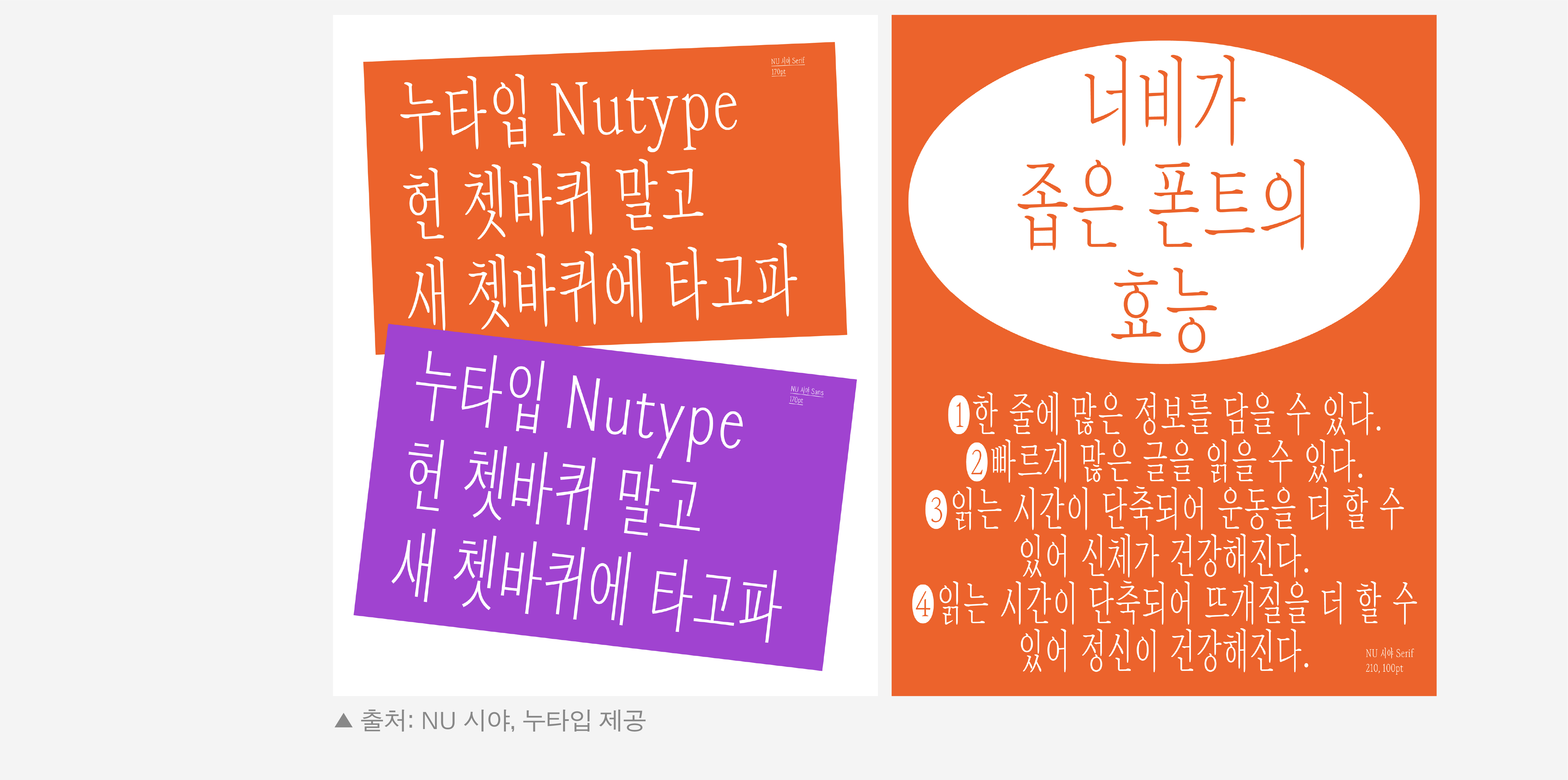 지난 9월, 새 글꼴 〈NU 시야〉 출시 소식과 함께 AG Font의 작가 브랜드, 누타입(@nutype.info)을 소개합니다. 세 명의 여성 타입 디자이너 김슬기, 김진희, 이수현이 모인 누타입은 글자의 보편적 쓰임을 넘어 예술 문화로 접목할 무한한 가능성을 탐구하며 새로운 글꼴 브랜드의 입지를 다지고 있습니다. 〈NU 시야〉의 개발 과정부터 흥미로운 작업 노하우 등 따옴표레터에서 누타입의 자세한 이야기를 만나보세요. |