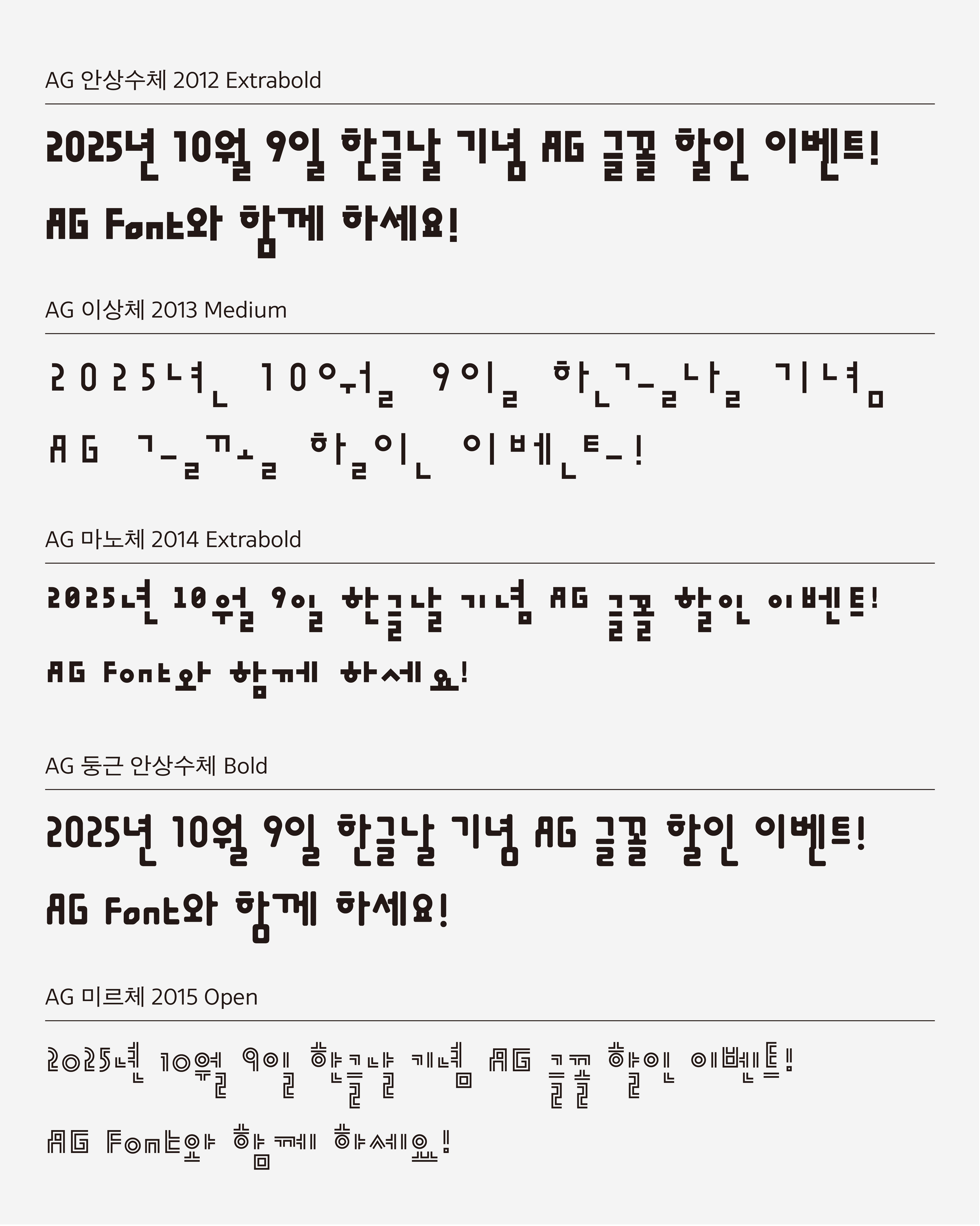 10월 9일, 한글날을 기념하여 8일간 AG 글꼴 할인 이벤트를 진행합니다. AG안상수체부터 둥근 안상수체, 미르체, 마노체, 이상체까지 모두 5종의 글꼴 가족을 최대 23% 할인된 가격으로 만나보세요.