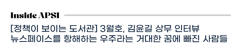 국립세종도서관이 발행하는 정책 전문 매거진 『정책이 보이는 도서관』 2026년 3월호의 주제는 '뉴스페이스, 우주를 품다' 입니다. 이번 호에는 우주항공청 우주수송부문장의 인터뷰와 함께, AP위성 김윤길 상무이사가 조명됐습니다.