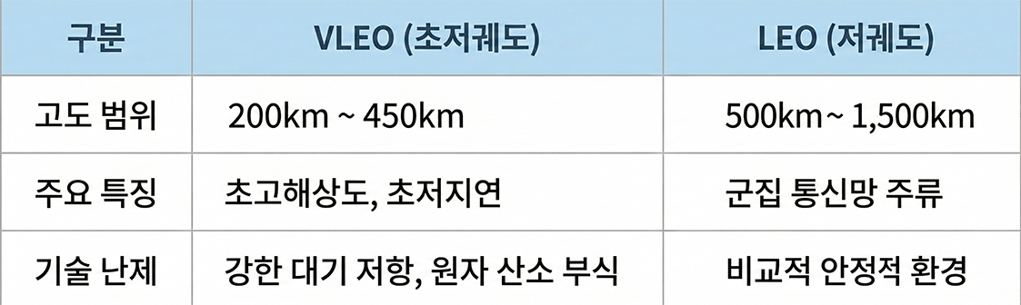 - '우주 쓰레기' 문제의 자연적 해결: 임무를 다한 VLEO 위성은 추진력을 잃는 순간 대기 저항에 의해 수개월 내에 궤도를 이탈하여 대기권에서 자연 연소됩니다. 가장 친환경적인 궤도입니다.