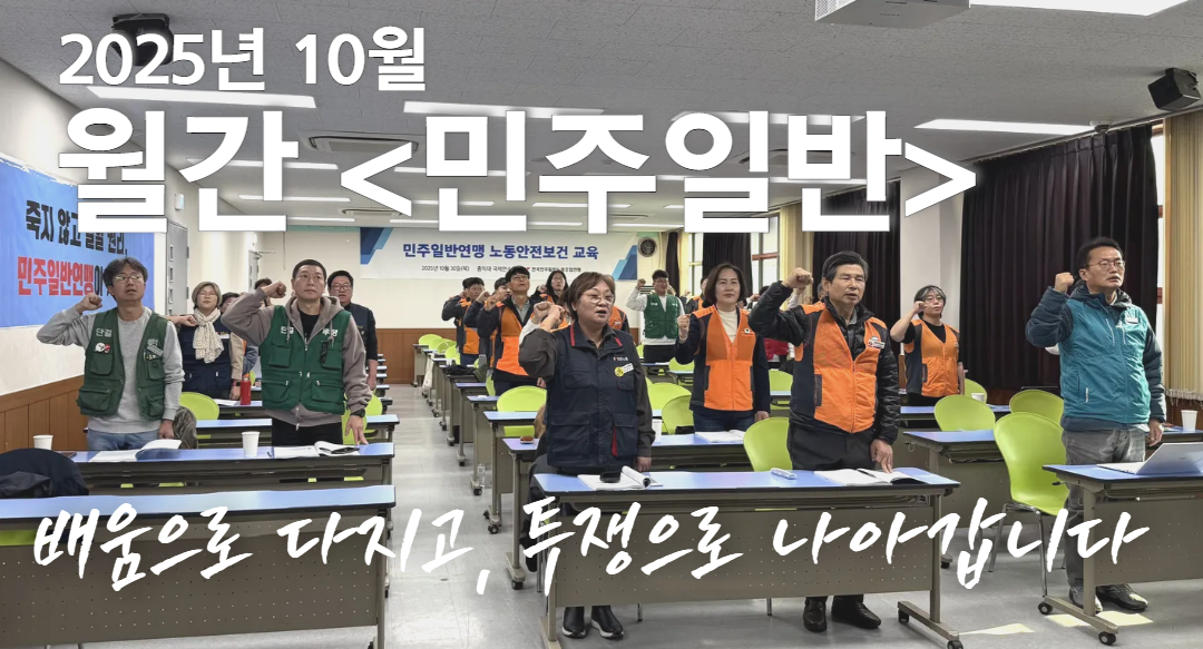월간 <민주일반> 10월호 10월, 민주일반연맹은 현장에서 배우고 함께 준비하며 한 달을 보냈습니다. 선전교실을 열어 간부와 조합원의 역량을 키우고, 노동안전보건 교육을 통해 안전한 일터를 향한 투쟁의 결의를 다졌습니다. 이어 11월에는 두 차례의 국회 토론회를 준비하고 있습니다. 그 시간의 기록을 〈월간 민주일반〉 10월호에 담았습니다. |