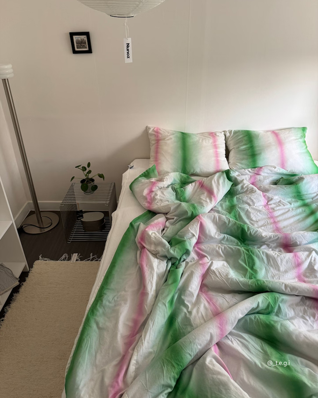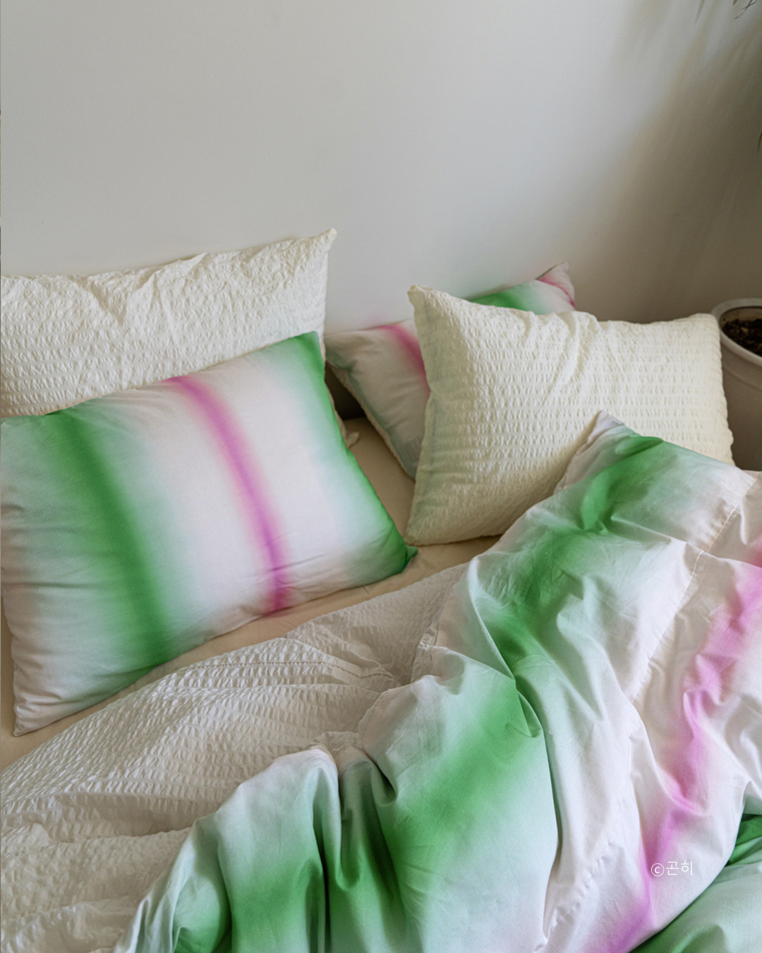 선명한 그린과 핑크 컬러가 침실 공간에 여름의 활기와 생기를 가득 불어넣는 @_t.e.g.i 1집러의 침실이에요.💚💗 면 주름 가공으로 잔물결 모양이 특징인 워싱 리플면은 통기성이 좋아, 더운 여름밤에도 피부에 달라붙지 않고 산뜻하게 사용할 수 있답니다. 보기만 해도 시원한 컬러 조합과 쾌적한 촉감이 만나 매일 밤 편안하고 상쾌한 휴식을 선사해요.