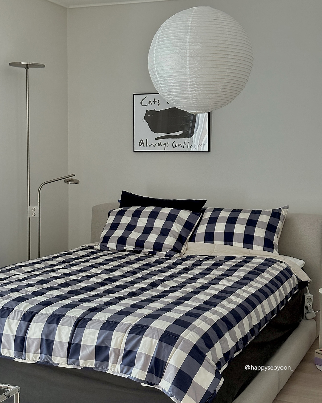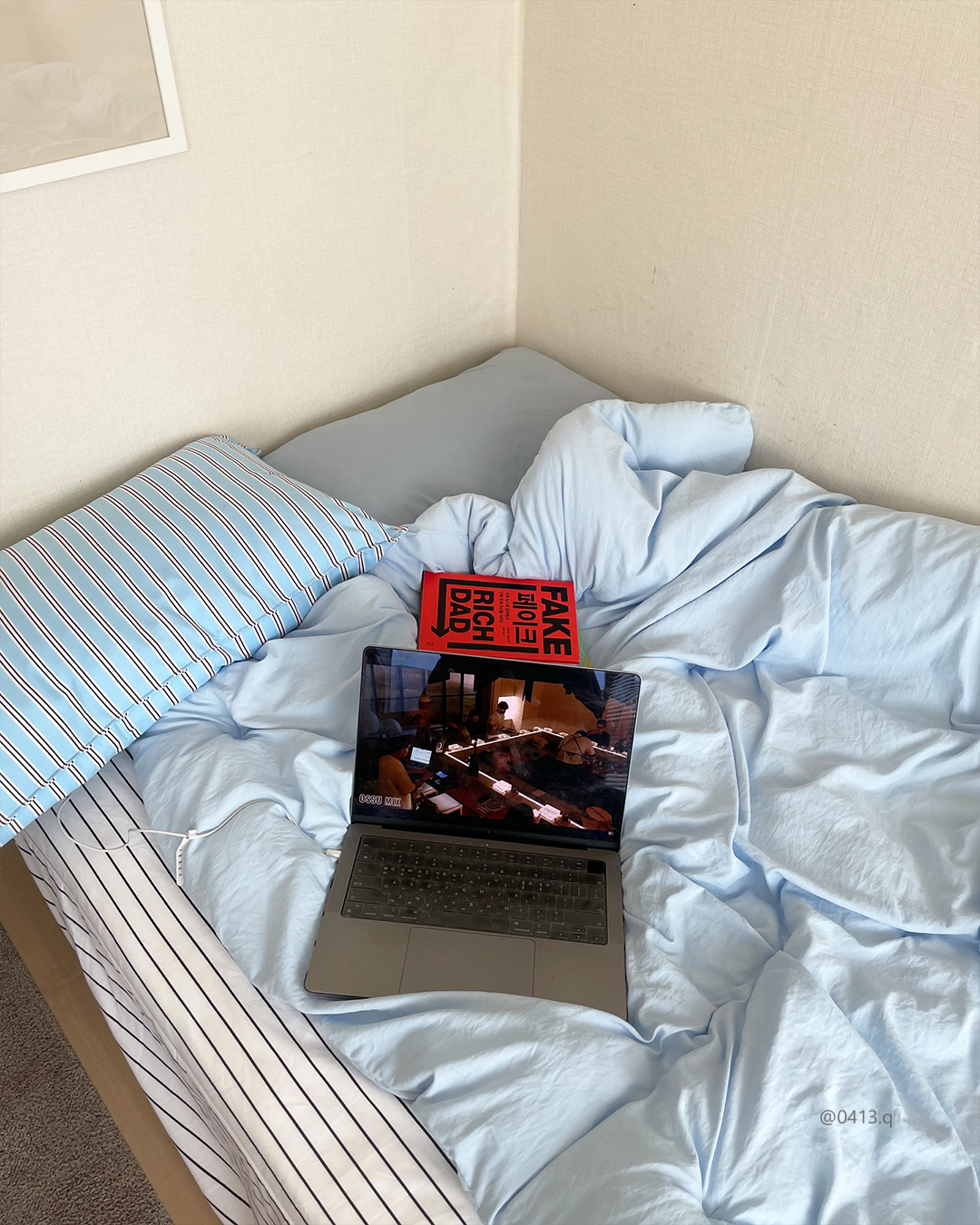 한여름, 무더운 공기를 식혀주는 건 꼭 차가운 바람만은 아니에요. @0413.q 1집러의 침실처럼 조화롭고 정돈된 공간은 시각적으로도 한결 시원한 느낌을 전해줘요.❄️ 얇은 스트라이프가 더해진 화이트 매트리스 커버는 여름의 답답함을 덜어주면서도 밋밋하지 않은 포인트! 침대 위 산뜻하게 내려앉은 화이트 스트라이프 덕분에, 침실의 분위기가 훨씬 더 가볍고 쾌적해요.✨
