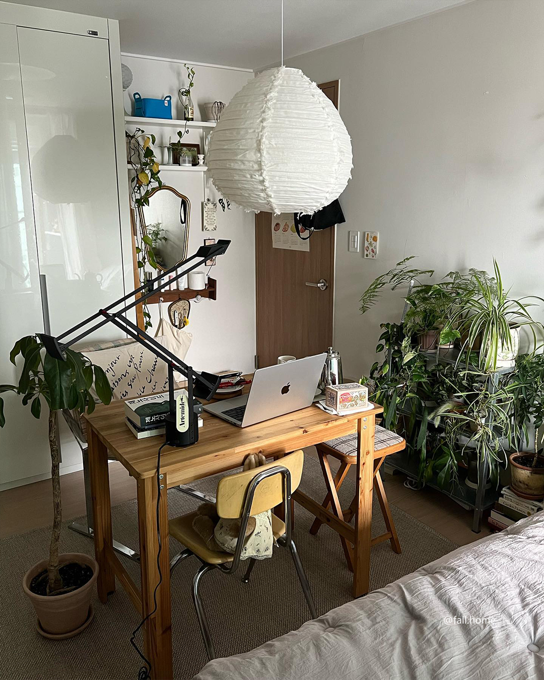 초록초록한 식물과 화이트 톤이 어우러진 @fall.home 1집러의 침실.🍃 여름 하면 떠오르는 대표 소재는 리넨이죠! 패브릭뿐 아니라 리넨 조명 갓 하나만으로도 계절의 분위기를 충분히 더할 수 있어요. 천장에서 은은하게 내려앉은 리넨 조명 갓은 공간에 자연스러운 멋과 시원한 여름 감성을 더해줘요.🌞 생기 넘치는 식물들과 우드 가구까지 편안한 조화를 이루며, 낮에도 밤에도 머물고 싶은 공간이 되었어요.