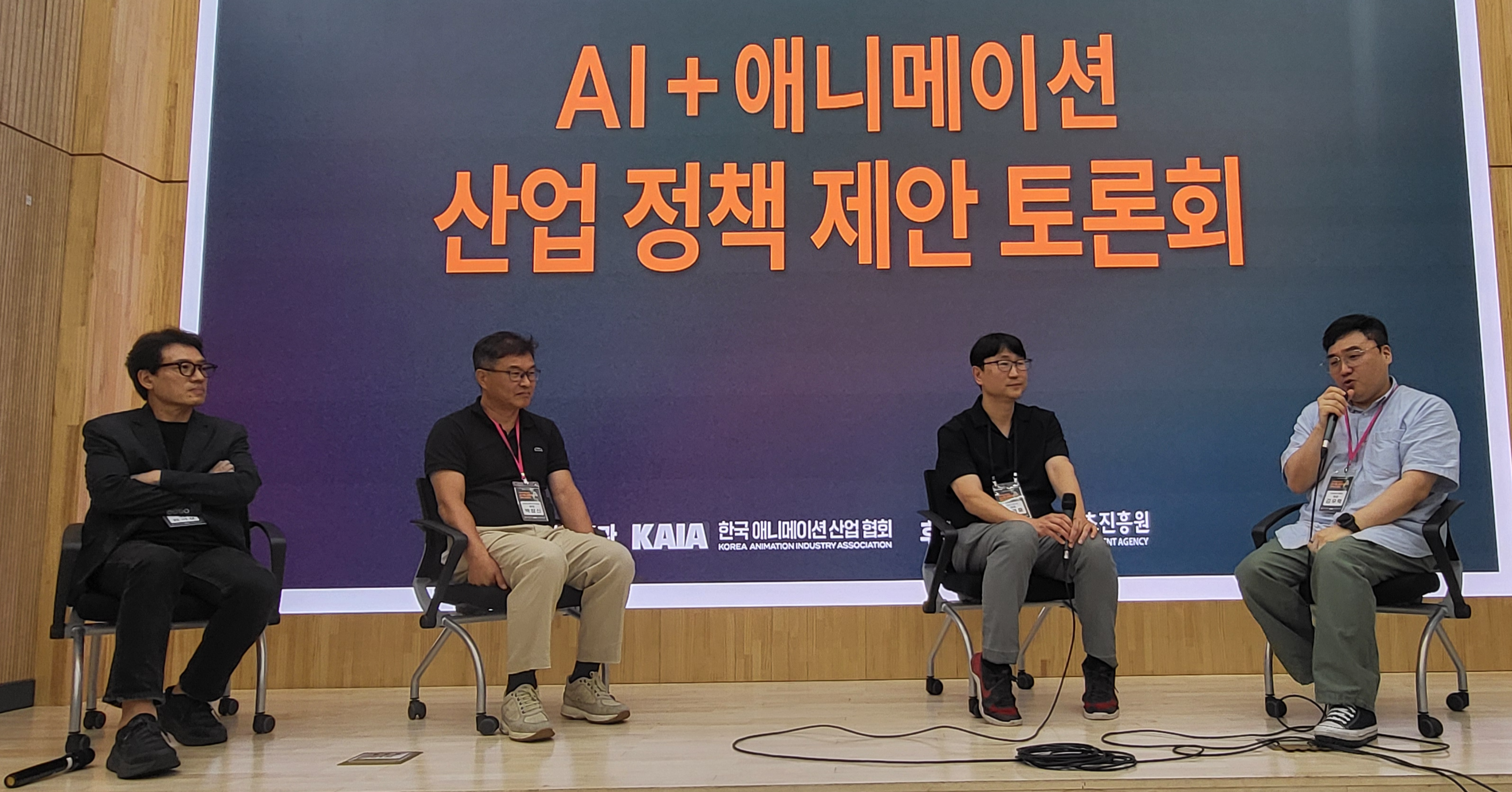 발표 이후 본 협회 박창신 회장, 정극포 부회장, 조경훈 부회장, 한국콘텐츠진흥원 김우택 팀장을 중심으로 회원사 전체가 참여하는 AI+애니메이션 산업 정책을 위한 토론회를 진행했다. AI를 활용한 애니메이션 산업에 대한 새 정부의 지원 및 향후 발전 방향에 대해 제안하고 모색하는 자리가 되었다.