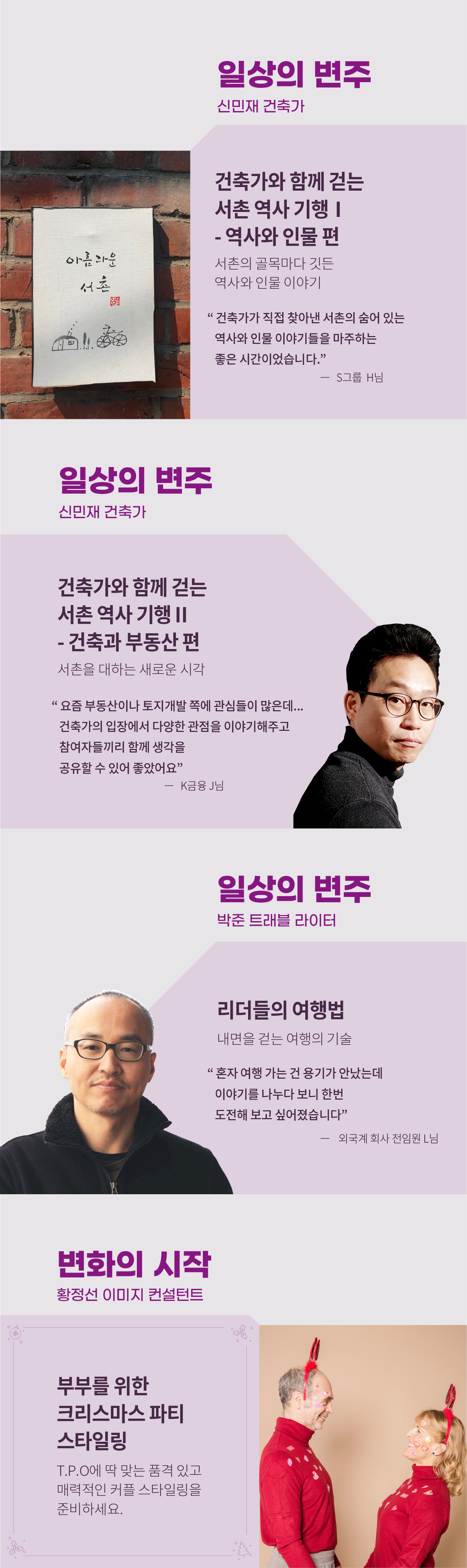 미래의 주역이 될 MZ세대들의 멘토가 되어주세요. 화담,하다가 MZ 커리어 준비생들을 위한 <MZ 멘토링 포지션 ('21년 2학기)>을 제안합니다. 본 프로그램은 리더들께서 직접 강의 주제를 제안하고 화담,하다가 기획과 운영을 지원하는 <학기제 운영 프로그램>입니다. 학생들과 1:1로 진행하는 세션이며 학생들이 원하는 방향에 맞는 분들과 매칭해드립니다. 멘토링 포지션에 관심있는 리더들을 기다립니다. 화담,하다 커리어 및 뉴업 트랙은 ‘22년부터 Membership 회원을 대상으로 운영될 예정이며, ‘21년 하반기까지 화담,하다 뉴스레터 모든 수신자 리더들께 열려있는 기회입니다. 더 많은 리더들이 참여하실 수 있도록 주변의 리더들을 초대해 주세요. 시즌 프로그램 소개 - 2차