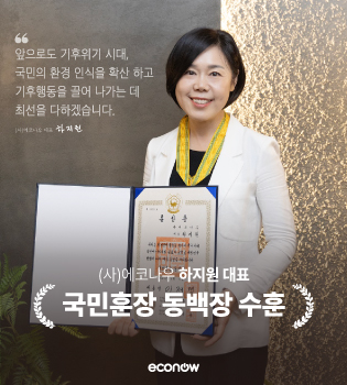 에코나우 하지원 대표가 올해 '환경의 날' 30주년을 맞아 환경 보전을 위해 헌신한 공로를 인정받아 환경보전 유공 훈장(국민훈장 동백장)을 수훈하는 영예를 안았습니다. |