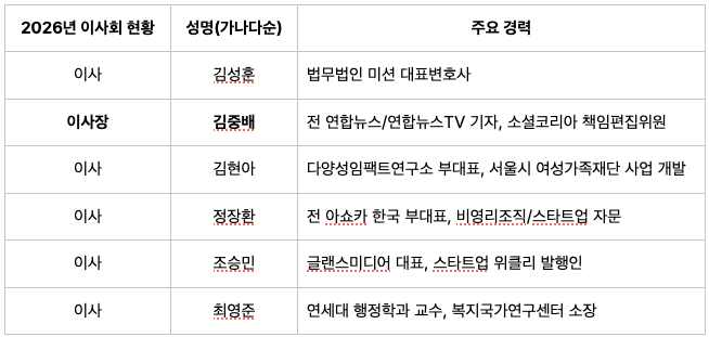 기존 이원재 이사장이 일신상의 사유로 사임함에 따라, 신임 이사장으로 김중배 이사가 선임되었습니다. 김중배 이사장은 기자, 연구자, 커뮤니케이터로서의 경험을 바탕으로 운영을 총괄하며 정책 생태계를 설계하는 역할을 맡습니다. 또한 다양성임팩트연구소 김현아 부대표를 신임 이사로 선임하여 복지와 성평등 등 연구 분야의 전문성을 강화하였고, 법무법인 미션 대표변호사이면서 우리 사회의 소통 및 공공성 강화에 천착해온 김성훈 감사가 이사로 참여하여 구체적인 연구와 공동 사업을 모색합니다. |