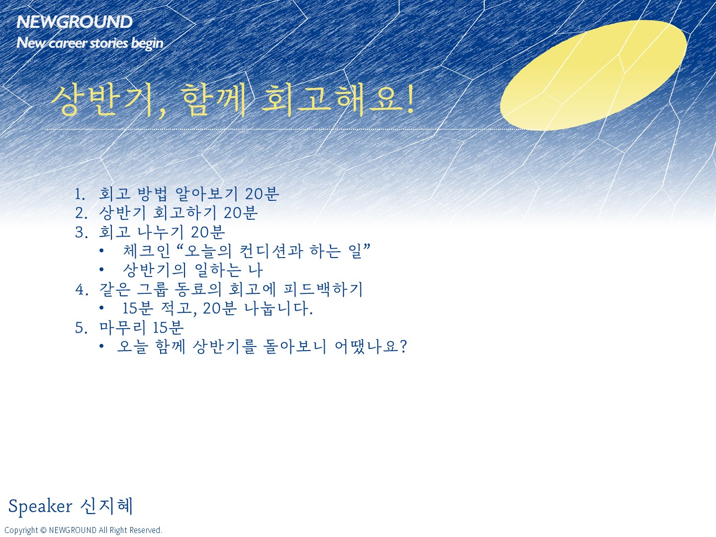 이번 주 총평: "제가 일을 많이 했네요!" 여름 특집 [Ready-get set-go!]를 기획하면서, 상반기를 함께 회고하는 프로그램을 열자는 이야기를 제일 먼저 했어요. 일에 집중하기 어려운 뜨거운 여름에 상반기를 정리하고 하반기를 맞이하기 좋다고 생각했기 때문이죠. 이미 뉴그라운드를 알고 소식을 접하고 프로그램을 신청한 분들은 일에 대한 욕심이 많으신 분들일 거예요. 일 이야기를 하는 것을 넘어서 기록하자고 하는 갓 창업한 회사에 귀 기울이시니까요. 물론 일에 관한 막연한 불안감으로 일과 건강한 관계를 맺지 못하는 것을 막기 위해서 기록을 제안하고 있어요. 더 나아가서 일하는 분들이 자기의 노력과 성취를 투명하게 들여다보고 분명한 언어로 정리하기를 바라고요. 월요일 저녁 8시에 상반기 회고에 참여한 분들이 가장 많이 한 말은 “제가 일을 많이 했네요!”였어요. 일 속에 파묻혀 지내다 보면 일을 많이 하는 감각은 있지만, 어떤 방향으로 나아가며 매일매일의 일을 해내고 있는지 알기 어렵습니다. 특히 저희는 자신을 채근하는 데 익숙하기도 하죠. 나의 성취나 노력한 과정을 스스로 충분히 인정하거나 칭찬하기를 어려워해요. 그래서 상반기를 회고하자고 했어요. 한 일을 충분히 돌아보고, 잘한 것과 아쉬운 것을 적어 보고, 성취에 충분히 머물고 아쉬운 점을 보완하며 하반기를 준비하실 수 있도록 말이죠. 역시나 워크숍에 참여한 분들의 상반기 일을 적는 워크시트는 빼곡했습니다. 문장에서 느껴지는 과정과 노력에 적은 분의 일의 맥락을 자세히 알지 못하는 저도 뿌듯한 마음이 들더라고요. 다들 정리할 시간을 내기 어렵거나 혼자서는 회고하기 어려워서 미루고 있다가 프로그램에 참여하셨다고 했어요. 그런 분들이 신청하시겠지 싶어서 2시간 안에 상반기를 회고하고 참여한 분들이 조를 이뤄서 피드백할 수 있도록 워크숍을 구성했고요. 나의 일 뿐만 아니라 지금을 사는 여성들은 어떻게 일하고 있고, 성취와 아쉬움을 어떻게 소화하고 있는지 나누게 되면 자연스럽게 서로의 레퍼런스와 인사이트가 되어주기 마련이더라고요. 이건 저와 효진 님이 뉴그라운드를 만들고 매일 배우고 있는 감각입니다. 다양한 자리에서 일하는 여성들이 담백하게 일 이야기를 할 수 있는 주제와 질문을 준비해서 워크숍을 진행하면, 서로에게 큰 배움이 될 수밖에 없다는 걸요. 상반기를 회고하며, 하반기에 자기가 원하는 변화를 주도적으로 준비할 수 있는 구체적인 방법을 적고 워크숍을 마무리했습니다. 무엇을 새로 시작해야 할지, 그만해야 할지, 유지해야 할지 적다 보면, 행동을 상상할 수 있게 되고, 머리로 그려본 행동은 실천하기 쉬우니까요. 의외로 기록하는 힘은 대단해요. 바빴다는 느낌을 성취의 감각으로 정리할 수 있고, 추상적인 미래를 구체적인 행동으로 바꿀 수 있게 하니까요. 지금 있는 자리에서 하는 일에 파묻힌 느낌이 드신다면, 함께 일을 기록하며 분명한 성취의 언어로 정리해봐요. 다음 주에 기대되는 것 뉴그라운드 시즌 3 프로그램 모집 마감이 있습니다. 8월 29일(일)까지 신청을 받아요. 어떤 분들을 만나게 될지, 어떤 일 이야기를 나누고, 지지하고, 연결될지 기대됩니다. 이 방송을 통해서 여성 스포츠 선수의 능력에 주목해 달라는 당연한 이야기를 오랫동안 꾸준히 해온 국가대표들의 과거와 현재를 보았어요. 이들이 만들어낸 현재의 변화에 뭉클해서 조금 눈물이 나기도 했어요. 여성 운동선수에 대한 차별을 돌려서 이야기하지 않고 묵직하게 직구로 던지는 다큐멘터리여서 더 반가웠습니다. 이 방송을 만든 이은규 PD의 경향신문 인터뷰 ‘국가대표’ 성차별 짚은 이은규 PD, 여성 다큐 계속 만드는 이유도 읽어 보세요.