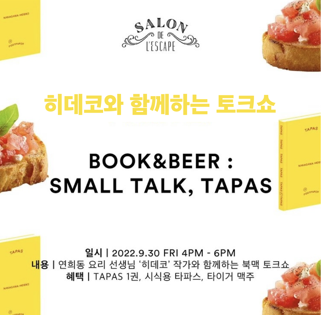 올해 초 출간한 책 'TAPAS'는 최근 2쇄가 나왔습니다. 레스케이프 호텔에서 토크하는 자리를 만들었어요. 시원한 맥주 그리고 제가 선보이는 맛보기 타파스와 함께 여행 느낌을 물씬 느끼면 좋겠습니다! 여행 후기는 아마 이 자리에서 생생하게 들려드릴 수 있을 거 같아요! |