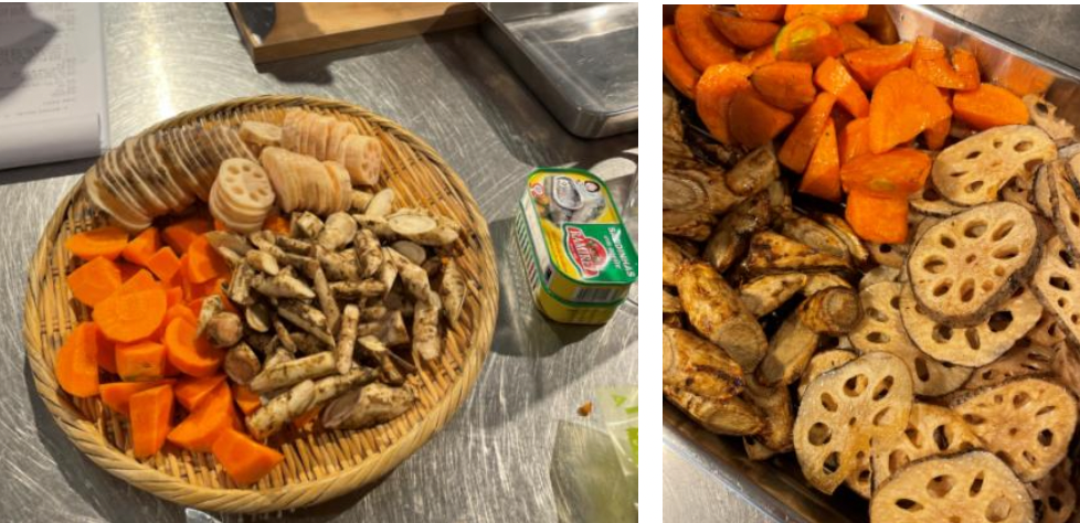 작은 연근 1개(200g), 우엉 1개, 당근 1/2개, 포르투갈 정어리 통조림(하미레즈) 1개, 튀김유