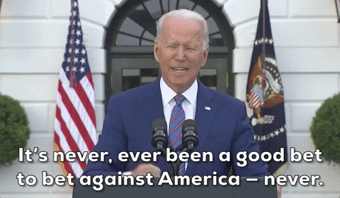 바이든 대통령이 즐겨 쓰는 영어표현: It's never been a good bet to bet against America. 직역하면 "미국의 반대편에 베팅을 하는 건 좋은 좋은 베팅이 아닙니다" 의역하면 "미국에 반대하면 재미없어"